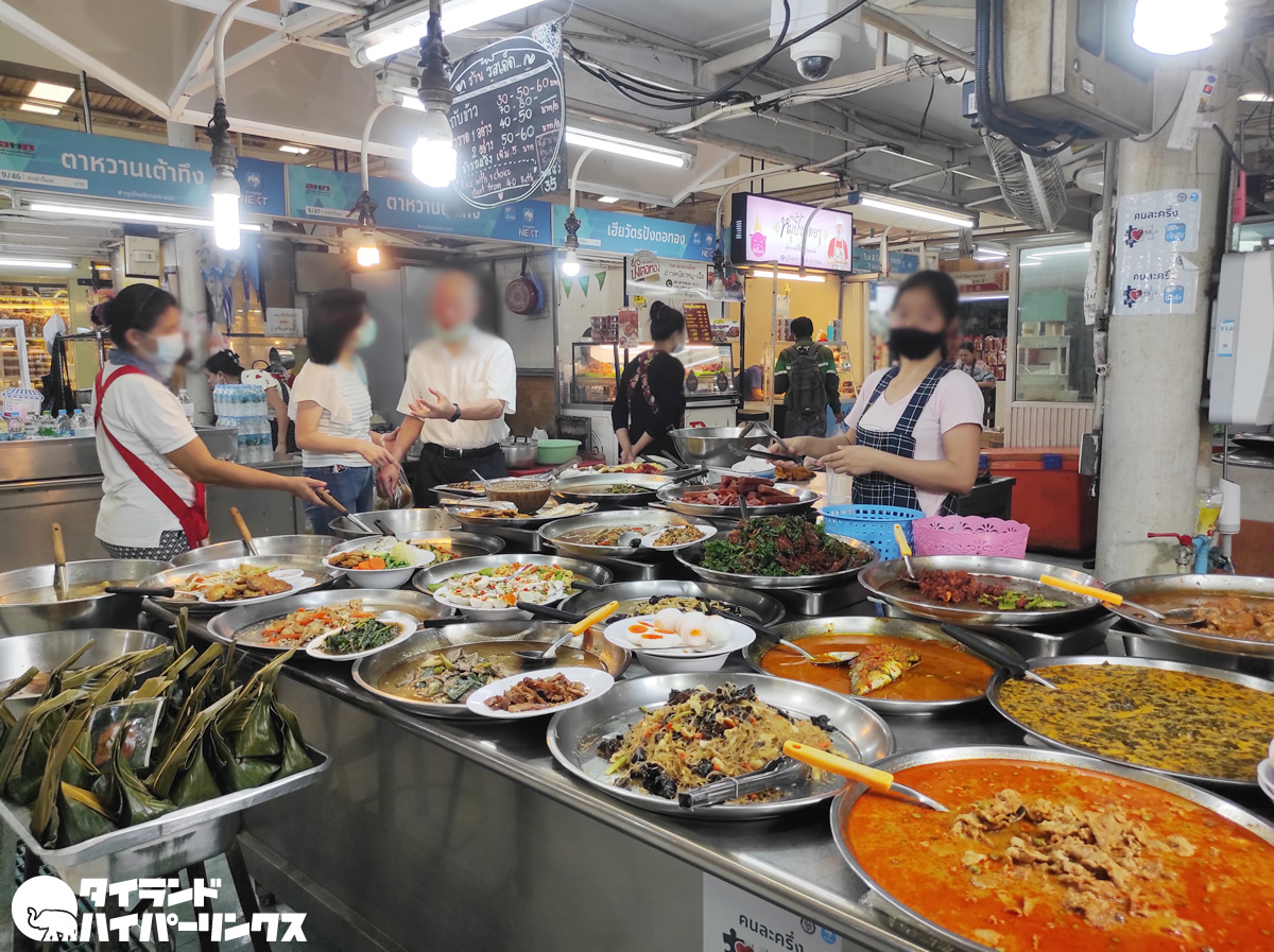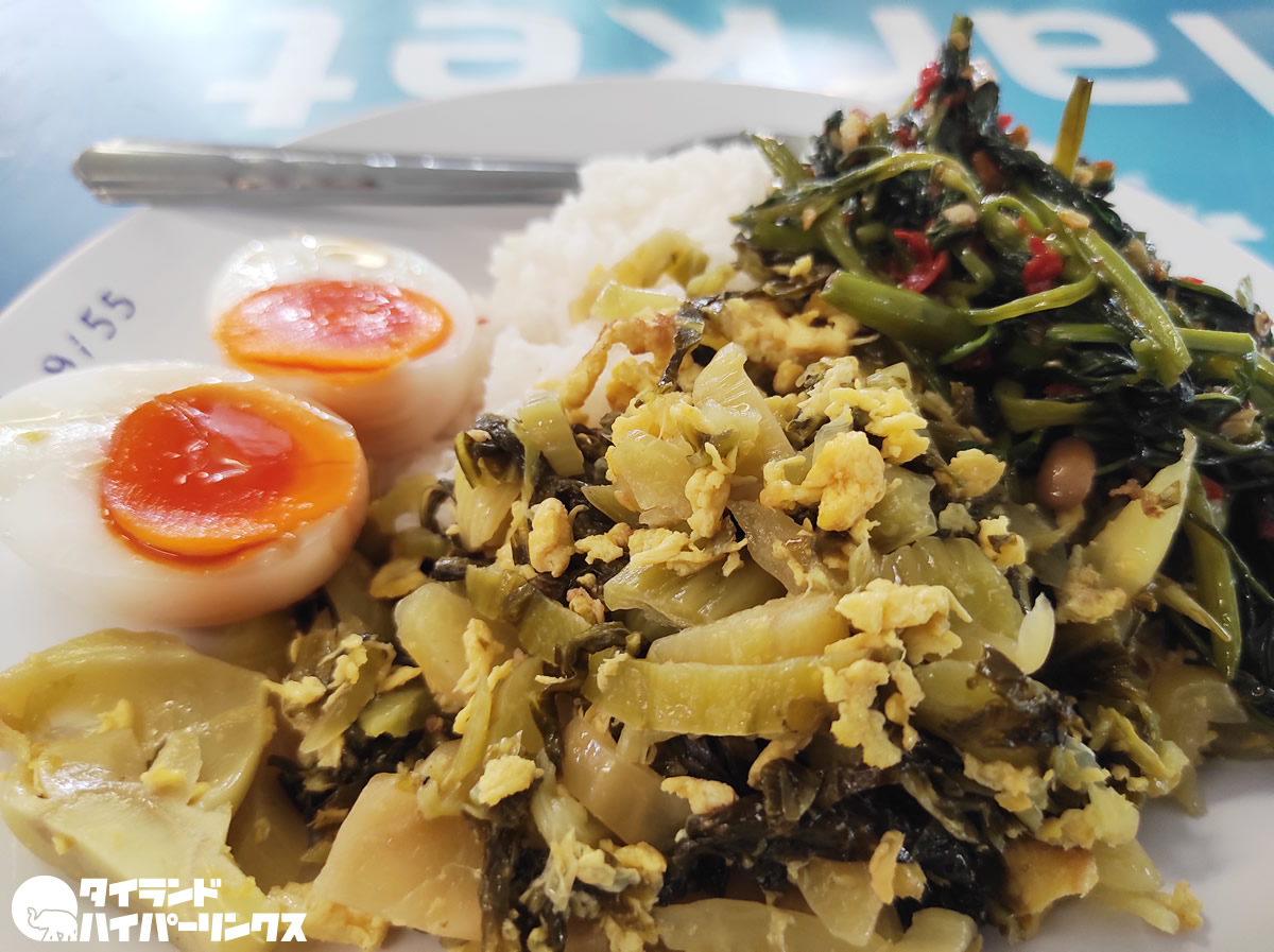 沢山のお店がある中で選んだのは、好きな惣菜を選んでご飯に乗せる「カオラートゲーン(ข้าวราดแกง)」のお店でした。このときは3品を選んで乗せてもらって料金は・・・