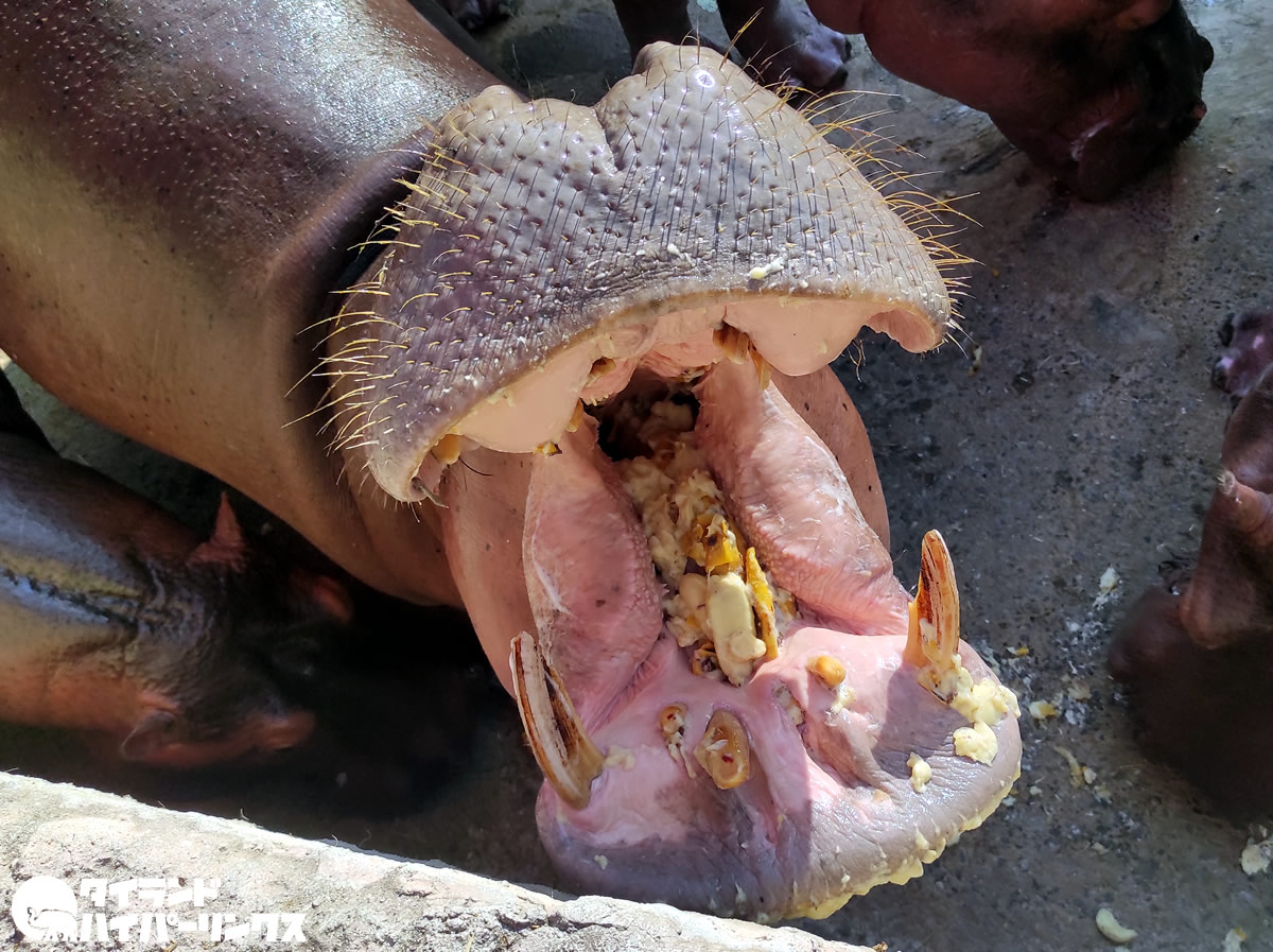 パックリ開いたカバの口の中をパチリ。良いものを見ました(笑)。