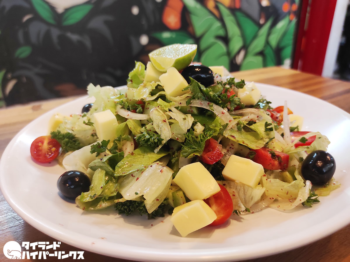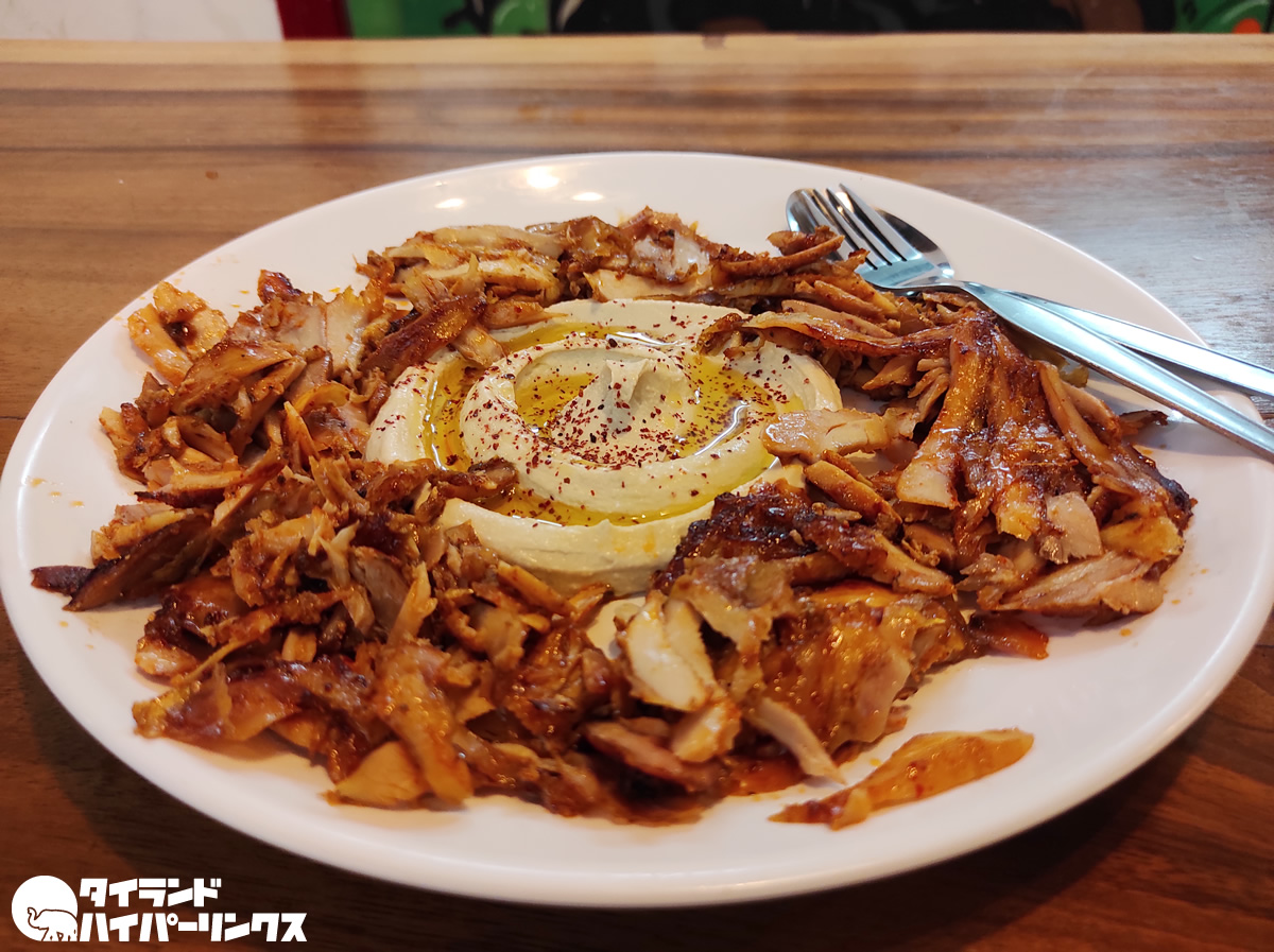 この日オーダーしたのは129バーツの「Hummus and Chicken(ホムス&チキン)」と90バーツの「Turkish Salada(ターキッシュサラダ)」と30バーツの缶コーラ。
