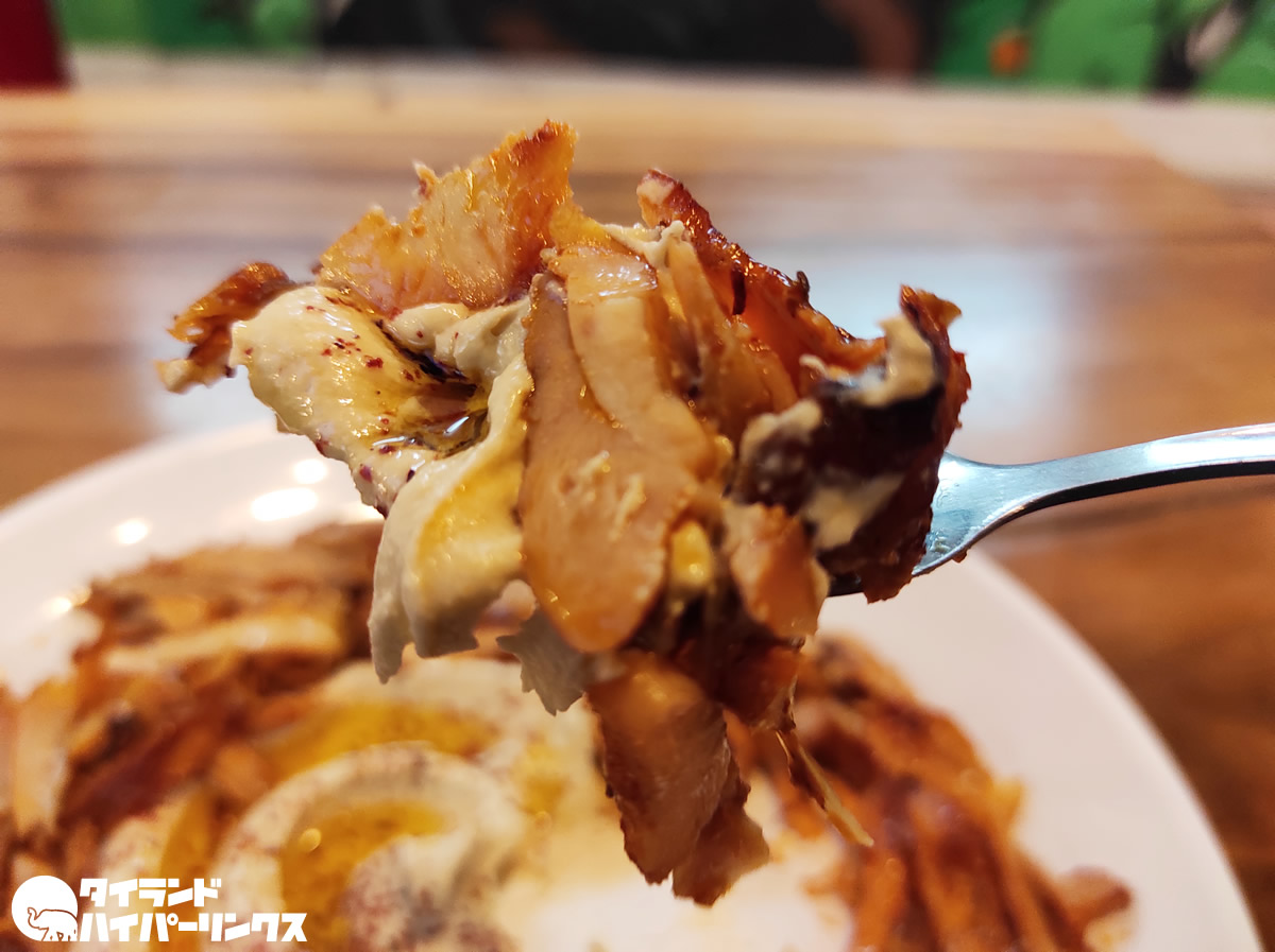 ホムスというのはヒヨコ豆のペーストで、アラブ料理にもよく出てきます。そのホムスと店頭でクルクル回ってる鶏のドネルケバブの盛り合わせですが、とにかく量の多いこと多いこと!