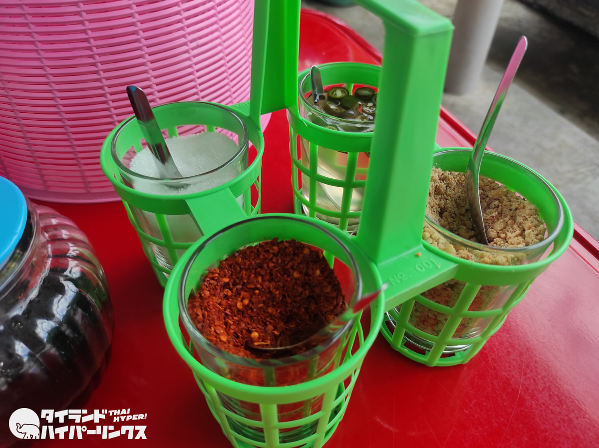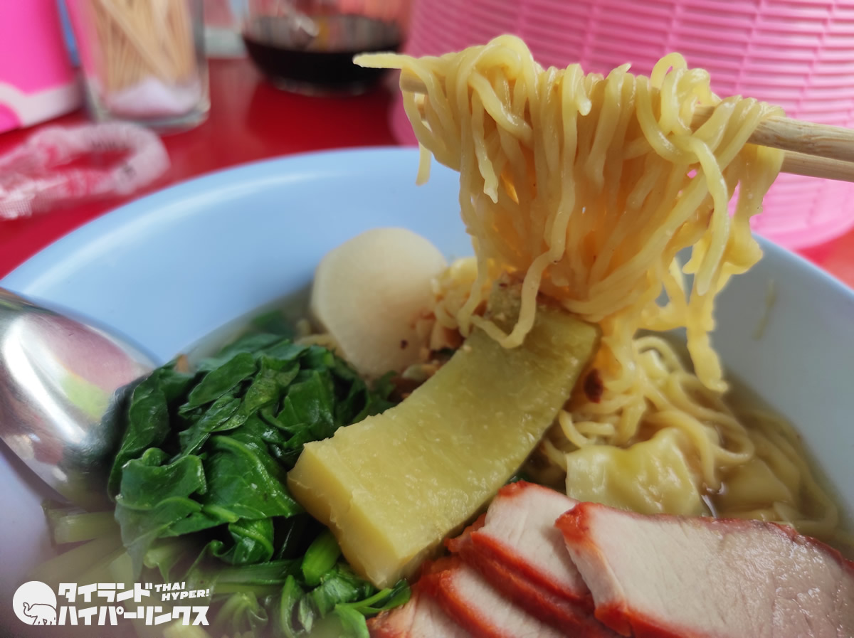 「クワイティアオ」というのは米粉麺のタイヌードルですが、パッケージのイラストを見ると、赤いチャーシュー「ムーデーン(มูแดง)」やワンタン「キヤオ(เกี๊ยว)」がトッピングされています。さらに砕いたピーナッツがふりかけられ、麺が黄色い(小麦粉麺)ところを見ると、ワンタン麺「バミーキヤオ(บะหมี่เกี๊ยว)」かもしれませんね。