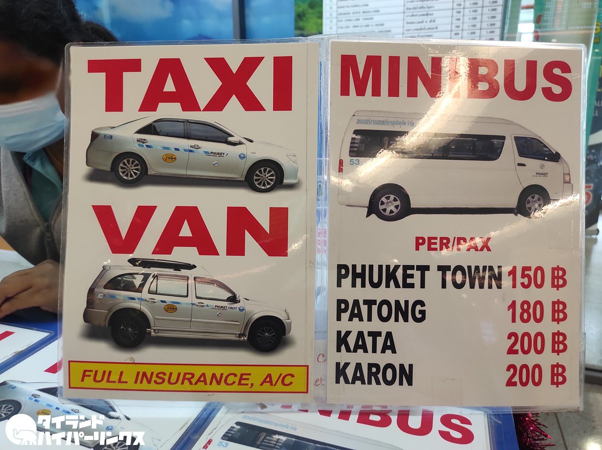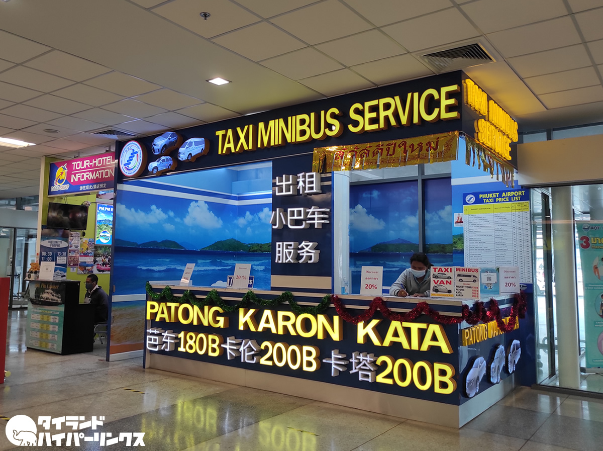 プーケット空港から街に出るには、ミニバスが安いと聞いていました。ミニバスなら200バーツ(約700円)でパトンビーチまで行けると知って、この日は決め打ち。プーケット空港に到着したら、すぐにミニバスのチケット売り場へ向かいました。