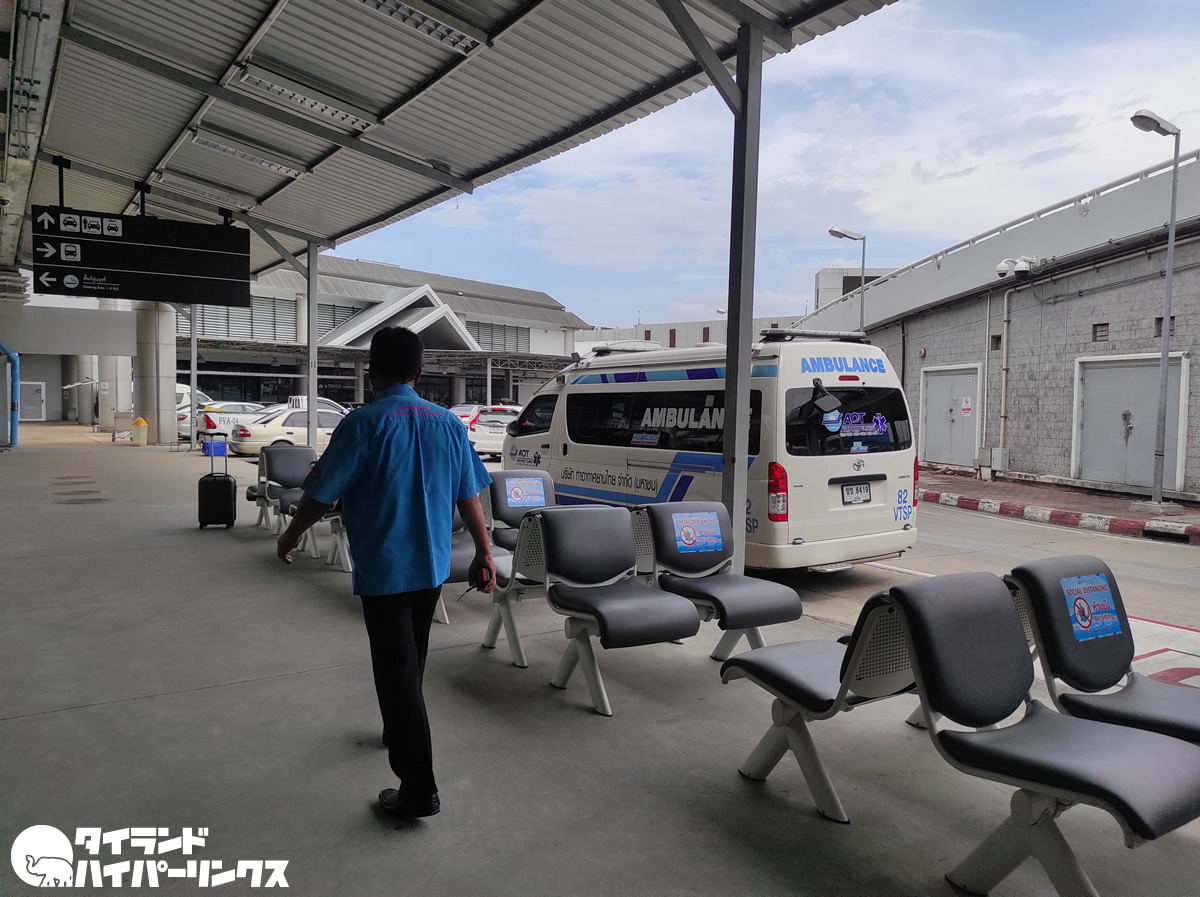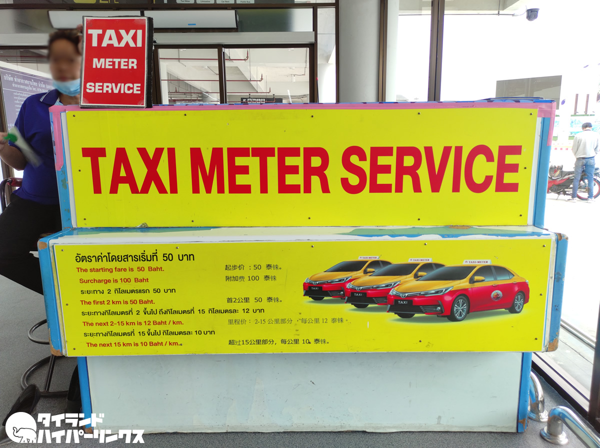 ちなみに傍にはメータータクシー乗り場もありますので、ご希望の方はそちらへ。メータータクシーの場合は初乗りが50バーツ。2キロ以降は距離に応じてメーターが上がります。また100バーツの空港タクシー手数料の支払いが追加で必要です。