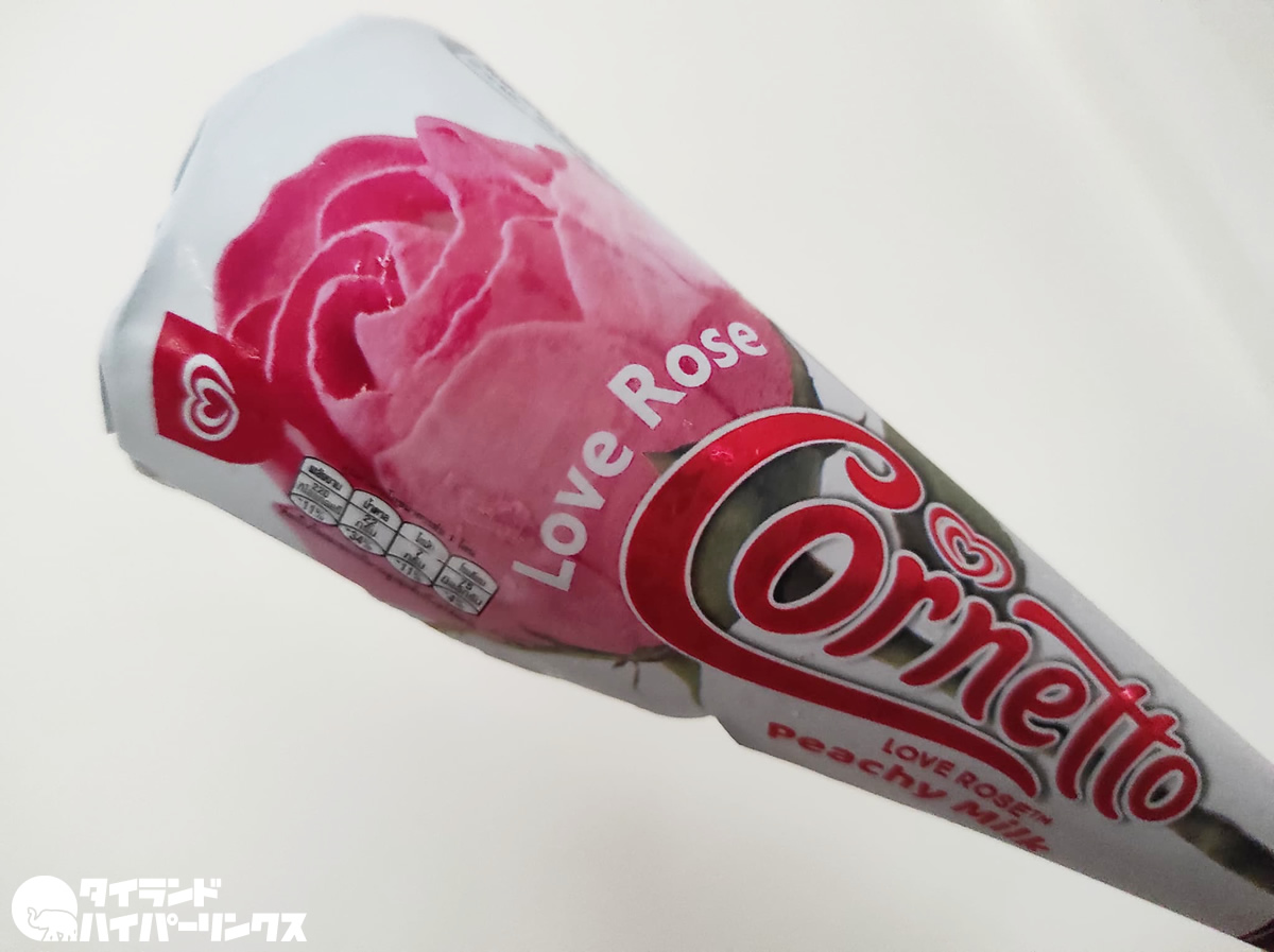 さて肝心の風味ですが、薔薇ではなくPEACHY MILKだそうで、つまり桃とミルク。優しい甘さで、女の子が大好きなこと間違いなし。今年のバレンタインデーは「Cornetto Love Rose」を贈るのもありかも?