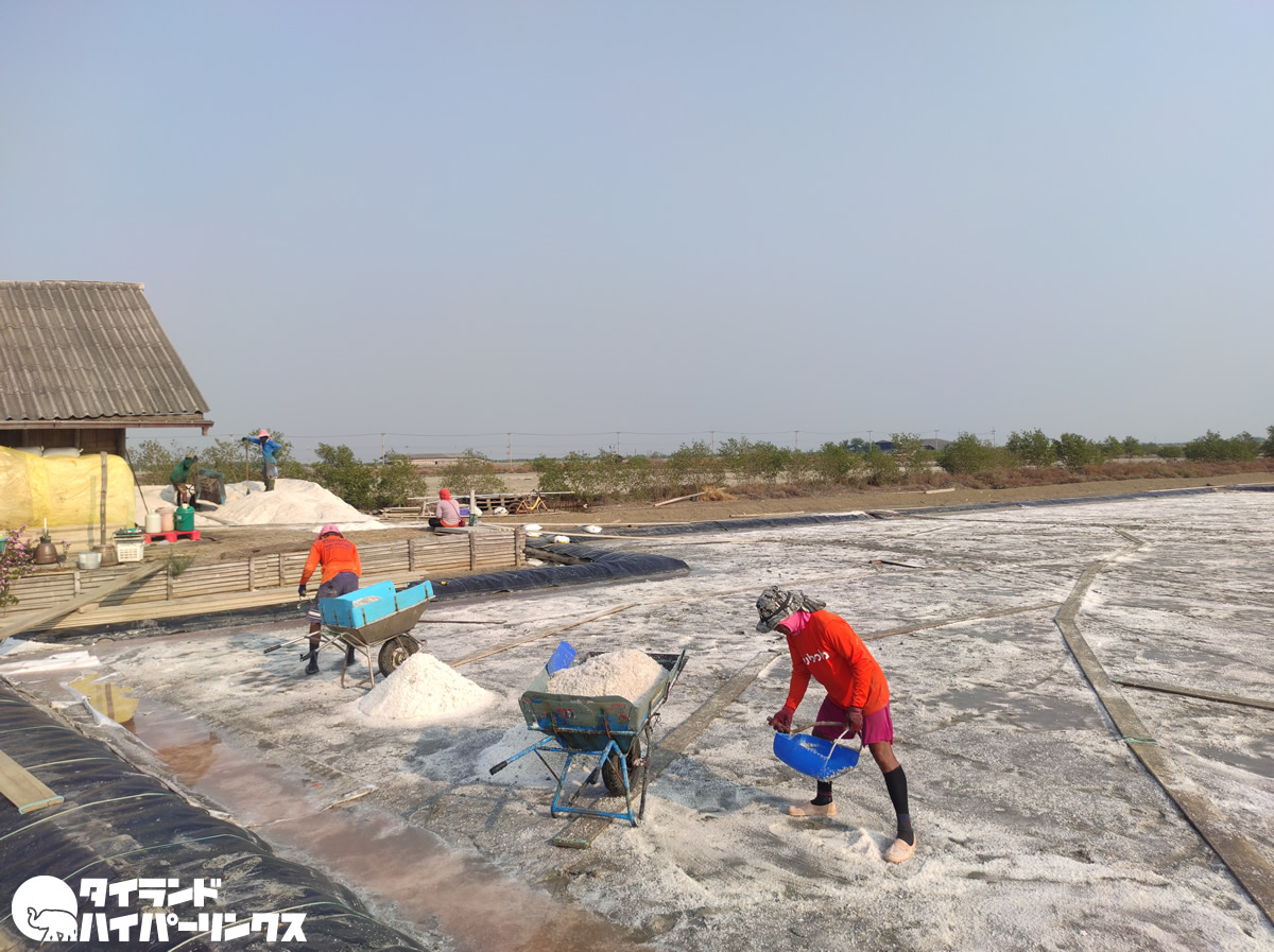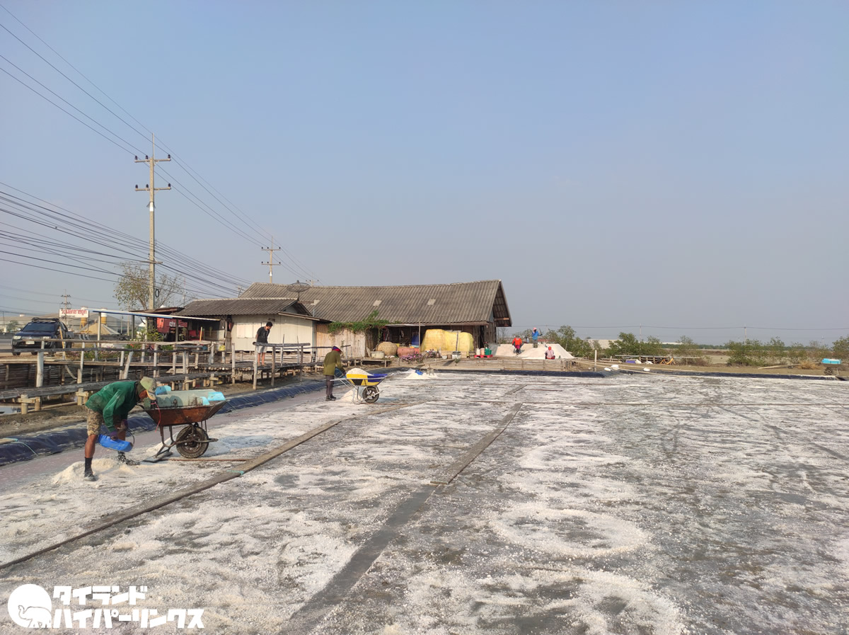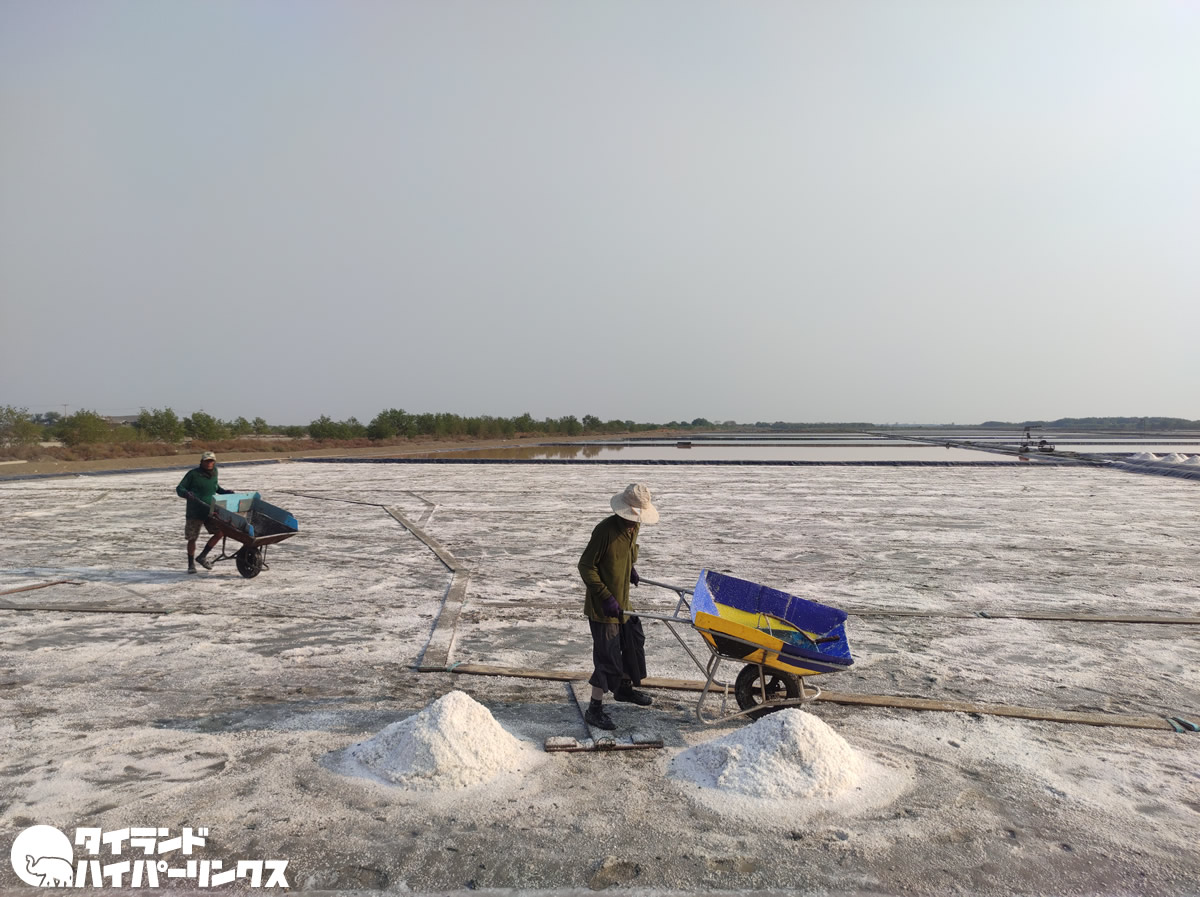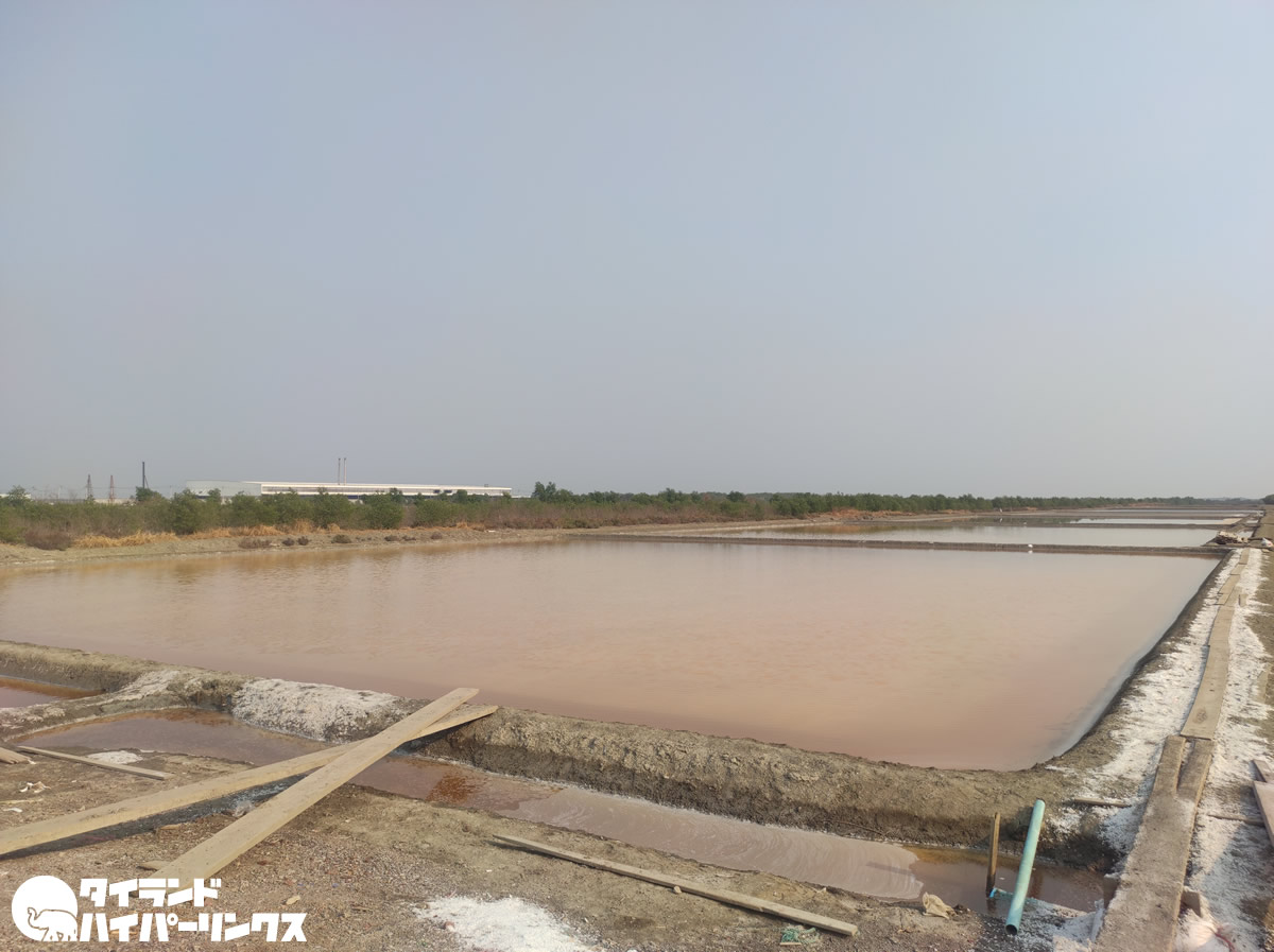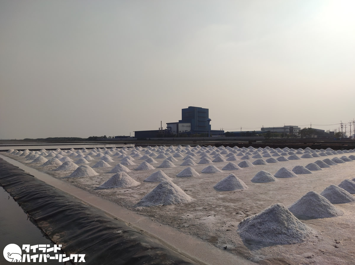 バンコクからメークロン線市場やアンパワー水上マーケットがあるサムットソンクラーム県へ向かう途中には、塩田が広がっています。塩田に海水を引いて、水が蒸発して塩が浮いてきたら、また海水を引いてさらに蒸発させ、それを繰り返すと、塩が溜まっていくのだとか。