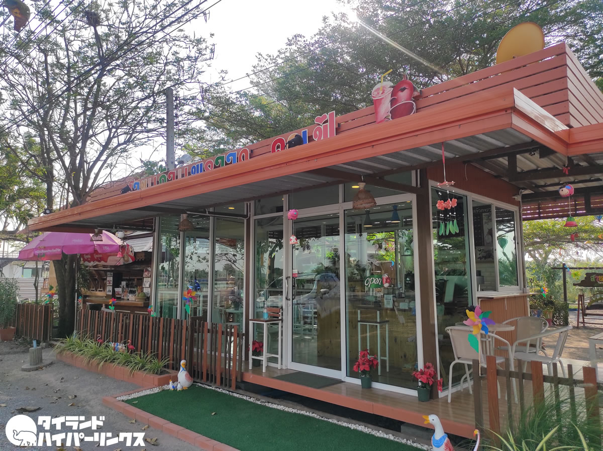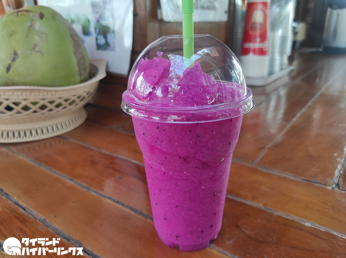 畑ではドラゴンフルーツの実を見ることはできませんでしたが、併設のカフェでドラゴンフルーツシェイクをいただきました。赤い実と白い実を混ぜたシェイクで、価格は35バーツ。甘さ控えめにしてもらって、さっぱり美味しくいただきましたが、たっぷりとシロップを入れた甘~いドラゴンフルーツシェイクも、さぞ美味しいことでしょう。
