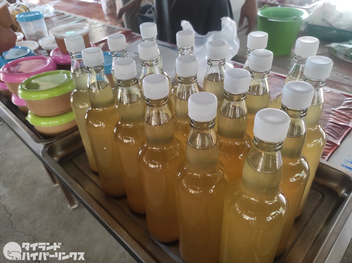 「ナムターンソッド(น้ำตาลสด)」は1本50バーツです。別の生産者は3本100バーツなどもっと安く販売していたりするそうですが、スタッフさんは品質を高めてこの価格なのだと自信をもって薦めてくれました。