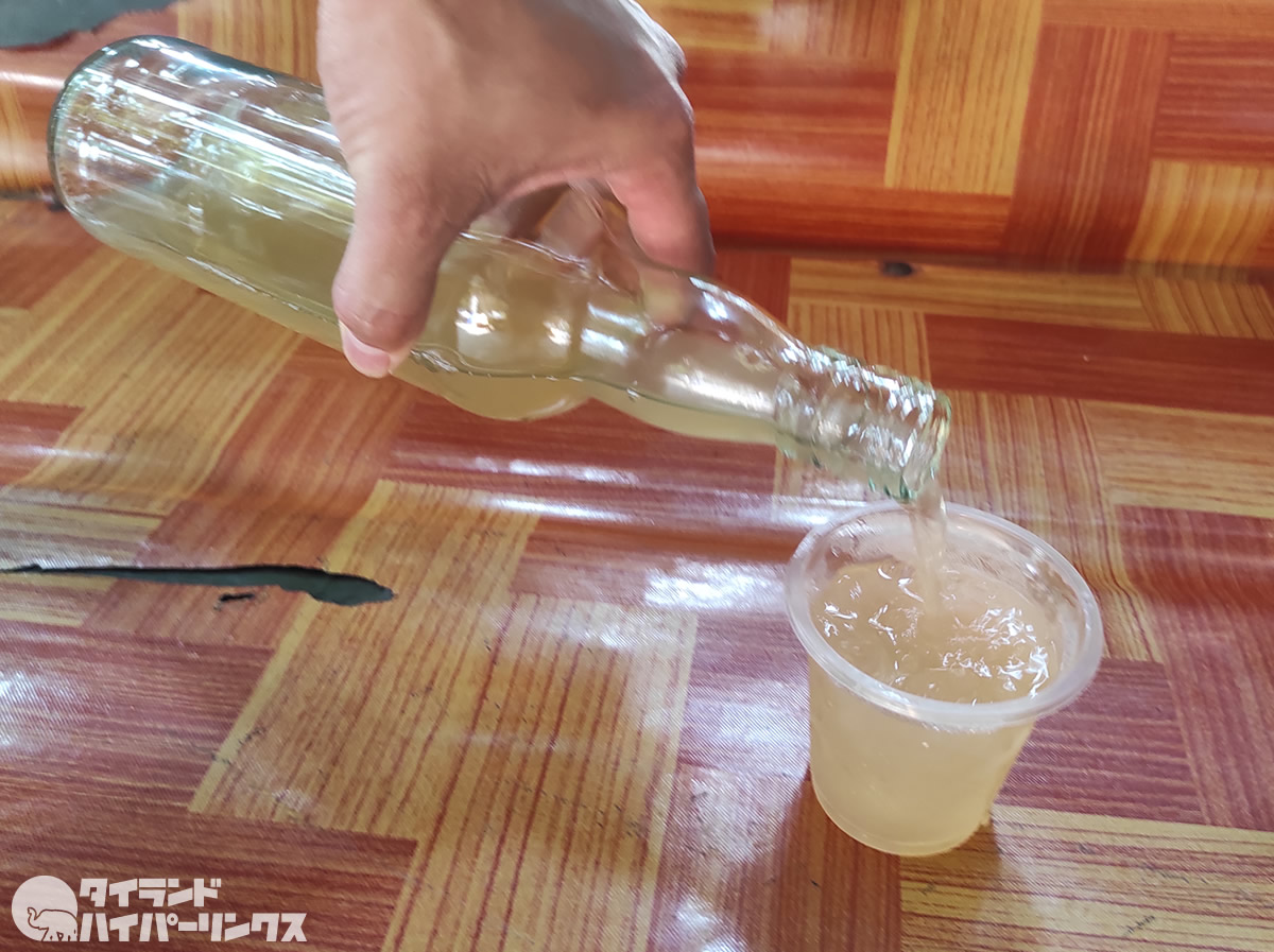 早速一口。ここの「ナムターンソッド(น้ำตาลสด)」は、スッキリとした甘さで「植物から出てきましたよ!」と伝わってくるかのような芳醇な香り、そしてほんのりココナッツの風味もするんですね!これは美味しい!手間をかけてできた「ナムターンソッド(น้ำตาลสด)」は、試す価値ありです!