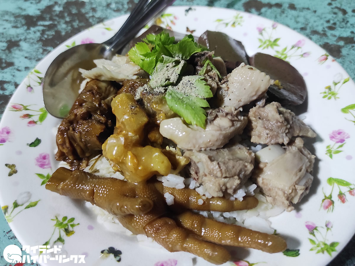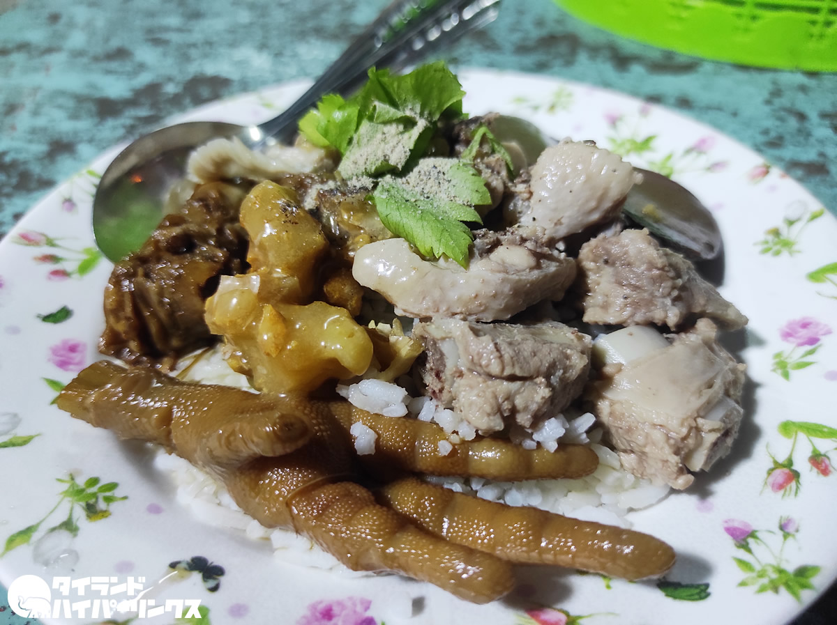 そして出てきたのがこちら。ご飯の上に、「カオトム」の煮た具材が乗っているという感じなんでしょうか。味は薄めで、タイでよくある「テーブルの上に用意した調味料で、自分好みの味に調節してください」というスタイル。ナンプラーや醤油、砂糖に胡椒やお酢や唐辛子などで仕上げます。