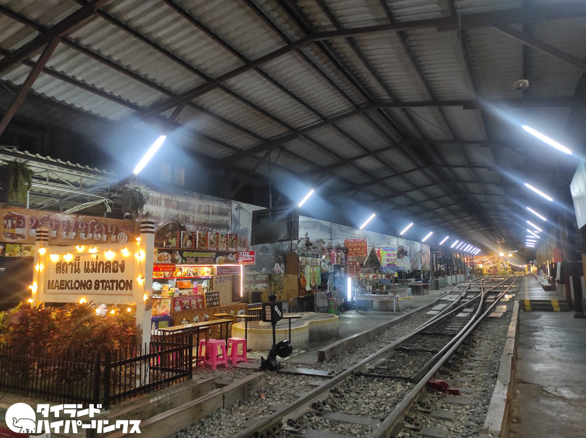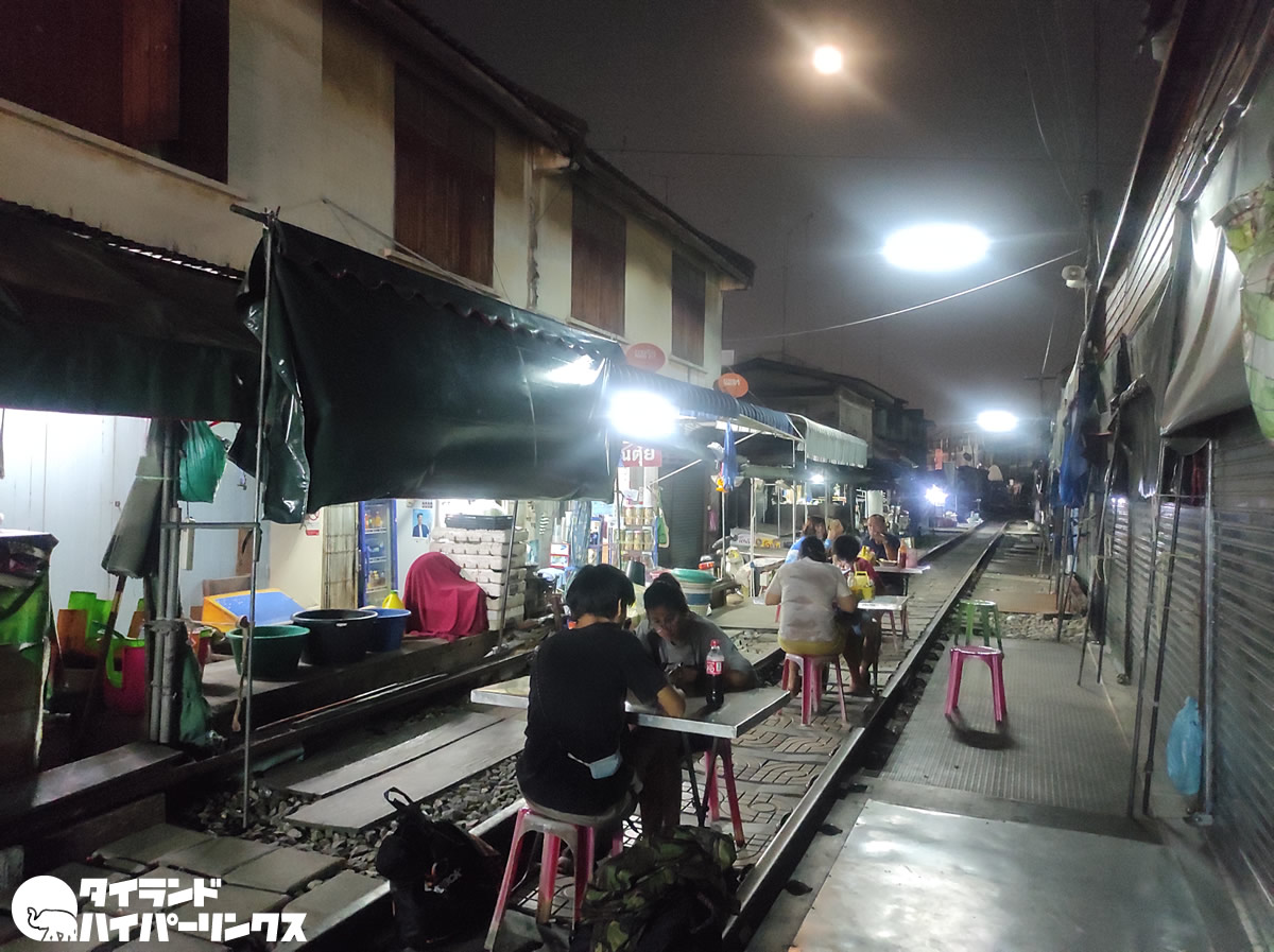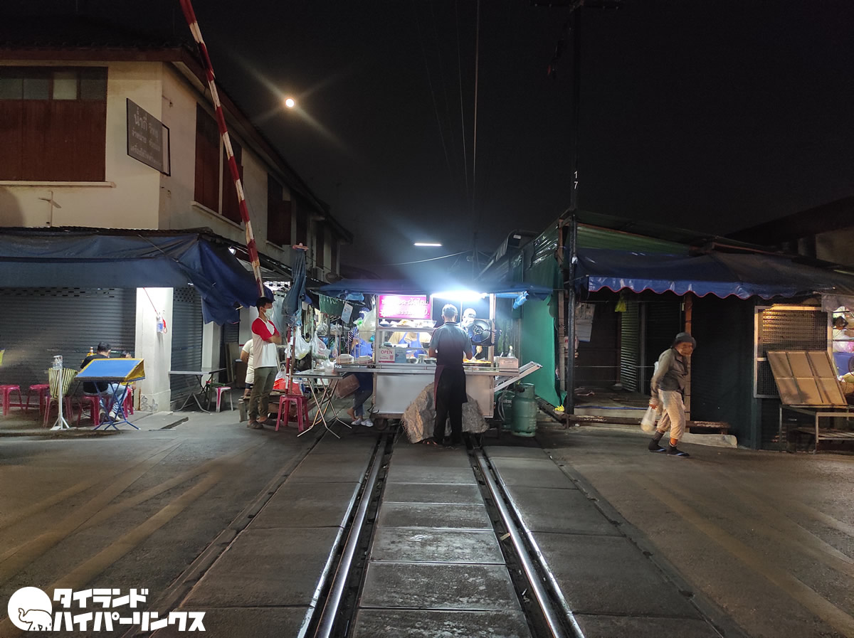 アンパワー水上マーケットでおなじみのタイ中部サムットソンクラーム県の、国鉄メークロン駅横の線路。昼間は、線路に店が出て列車が近づいたら片付けるという「折りたたみ市場」でおなじみの場所ですが、夜には踏切の場所にパッタイとホイトードの屋台が出ていました。