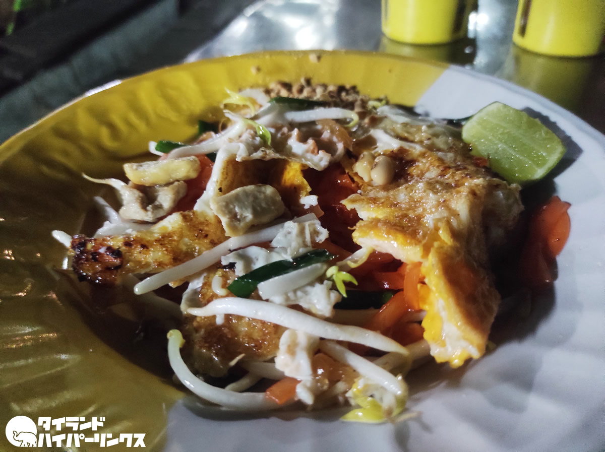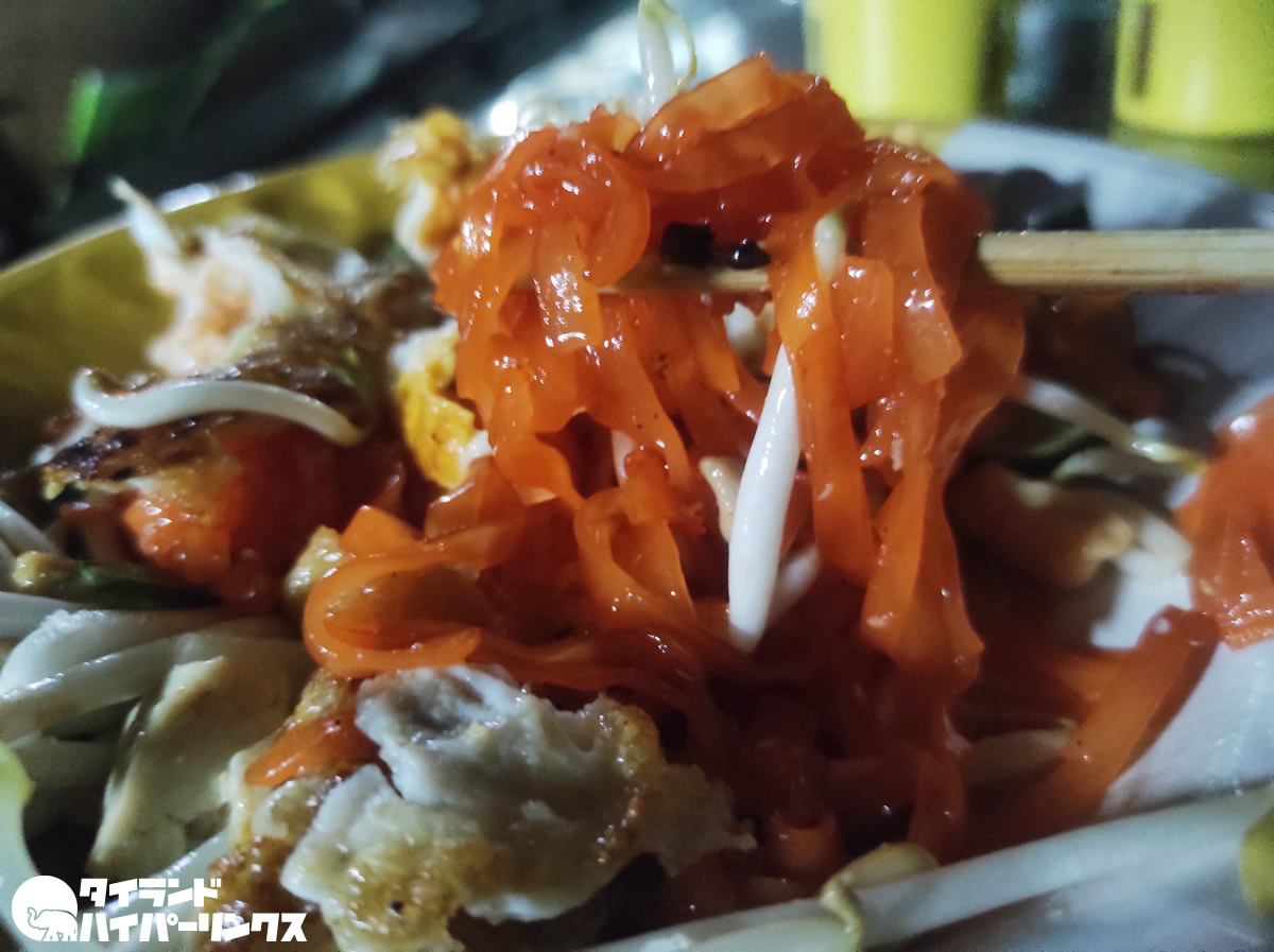 多くの人が集まるこの屋台のパッタイは40バーツ。タイ人好みの甘みの味付けでした。