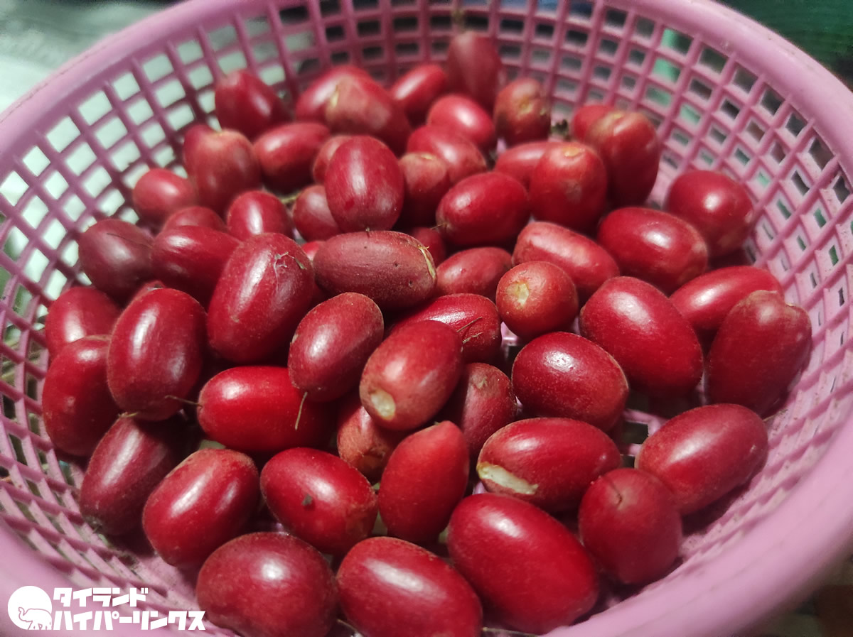 サムットソンクラーム県の食堂に入った際、入り口でいくつかのフルーツが売られていました。そのうちの一つがドングリくらいの大きさの赤い小さな木の実。名前を聞いてみると「ルークマハサチャン(ลูกมหัศจรรย์)」とのことでした。価格は籠いっぱいで10バーツ。