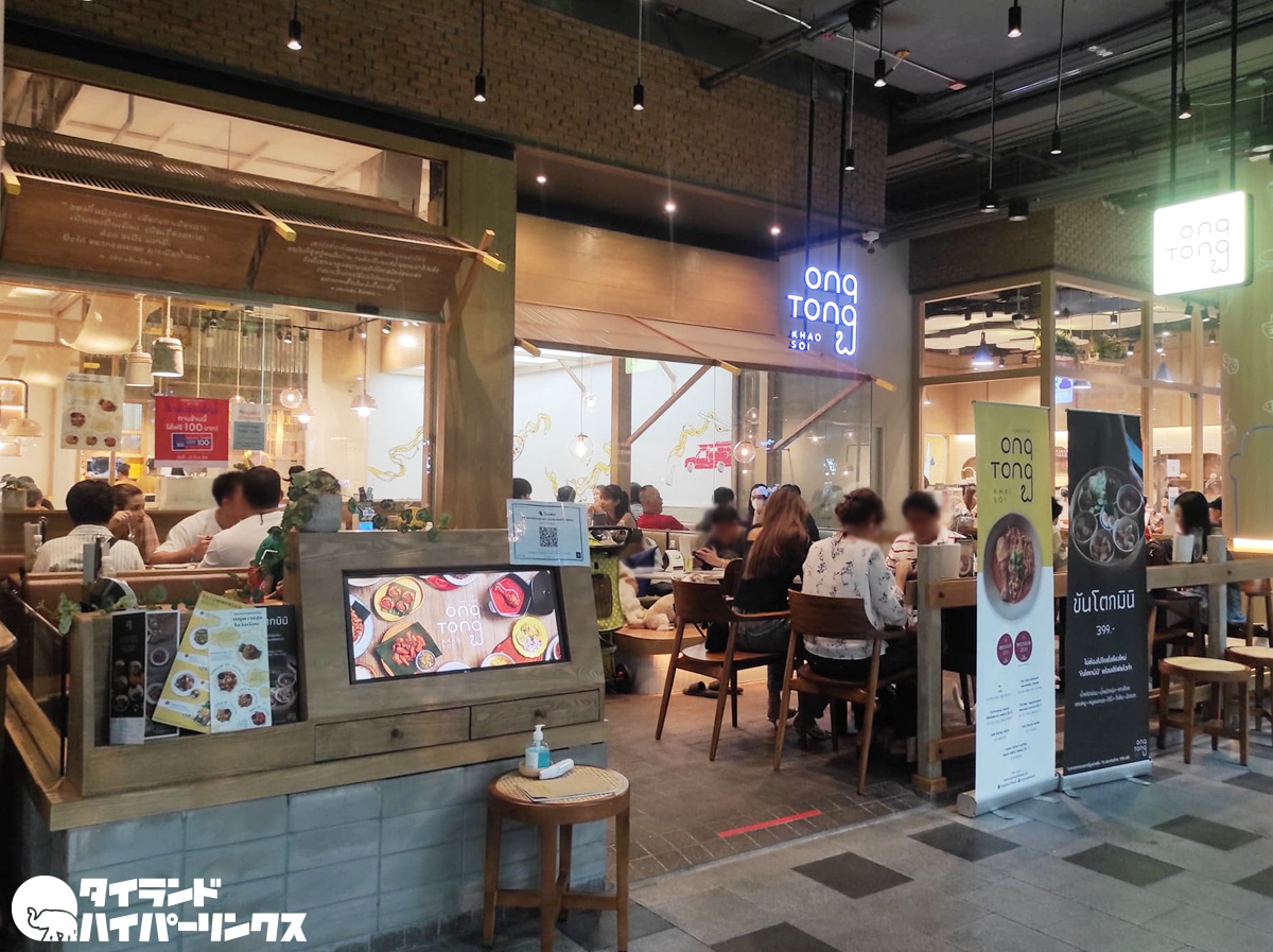 散歩をすればお腹がへるわけで、食事に訪れたのは北タイ名物カレー麺の店「オントン・カオソイ(Ongtong Khaosoi、อองตอง ข้าวซอย)」でした。屋外席(と言ってもセントラルフェスティバル イーストヴィル店内)では、犬を連れて一緒に食事をすることが可能です。この日の屋外席は、全員が犬連れでした。