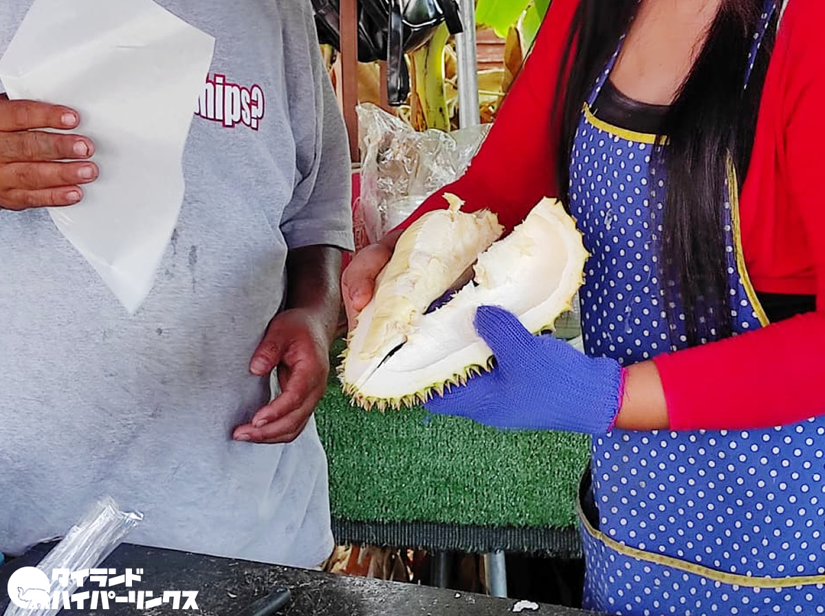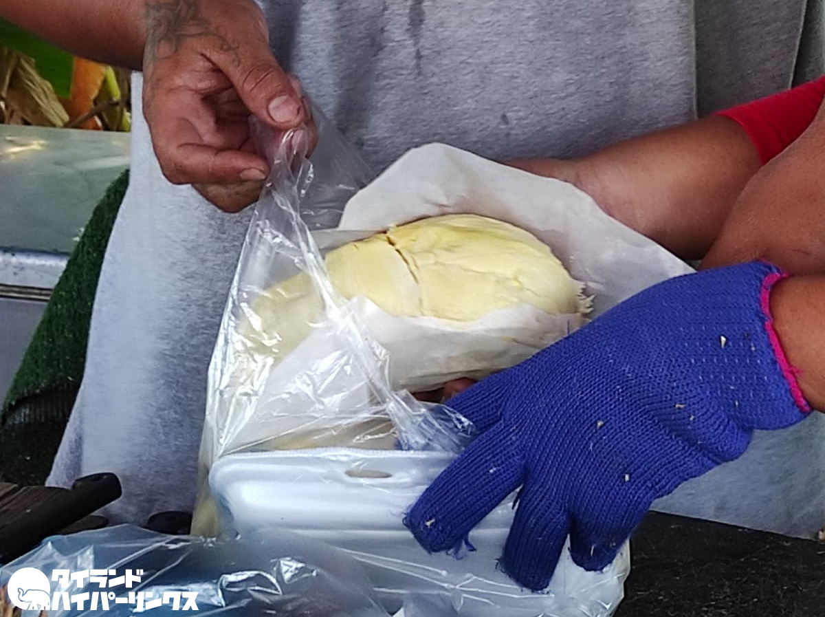 硬い皮の中に美味しい果肉が入っているドリアン。まるごと持ち帰って自分で割るのは大変な作業なので、その場で皮をとってもらって果肉だけ持ち帰ります。