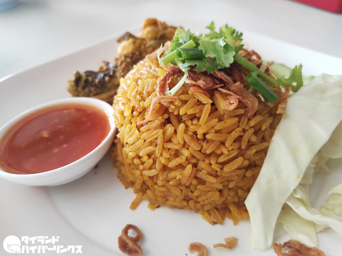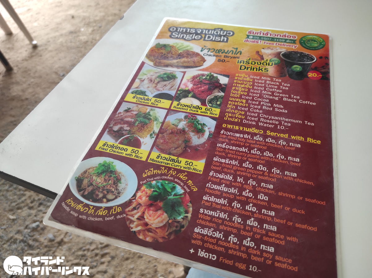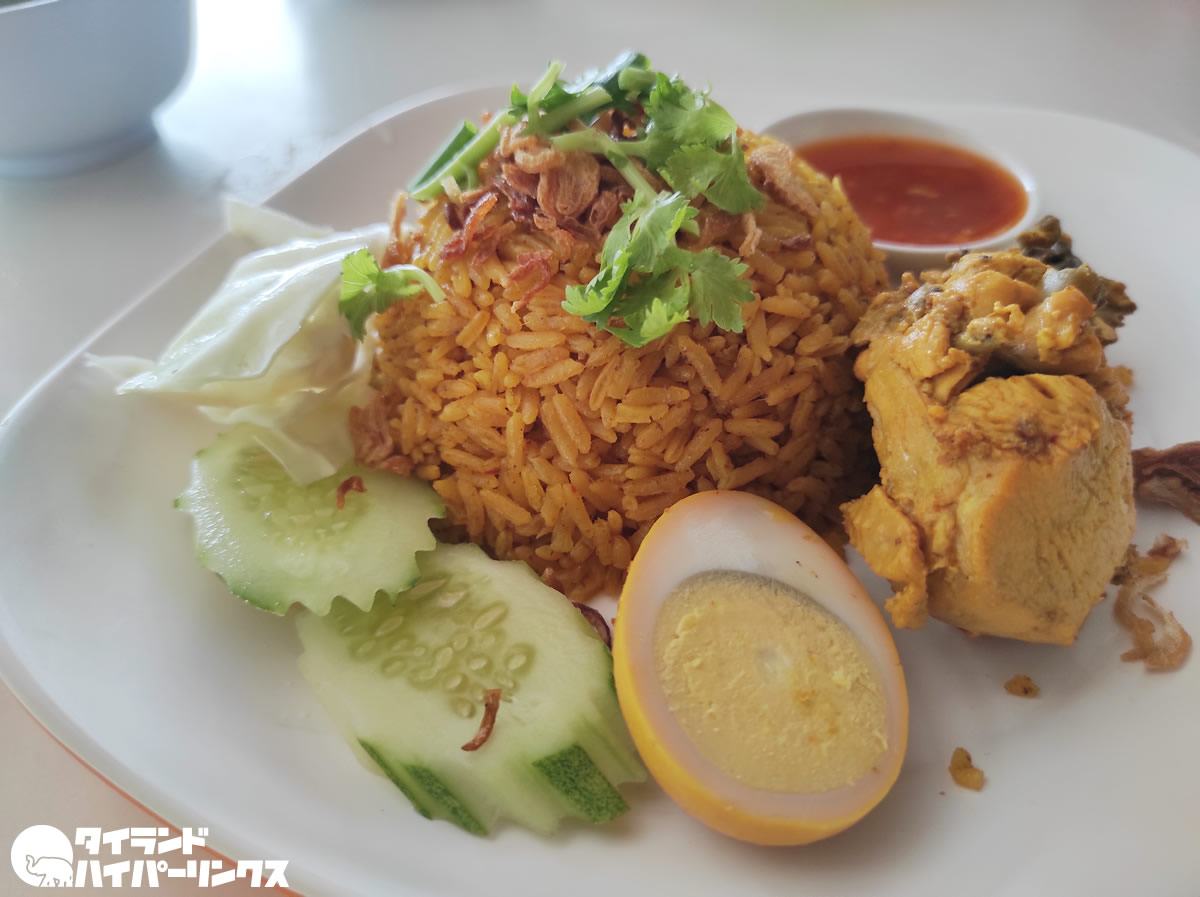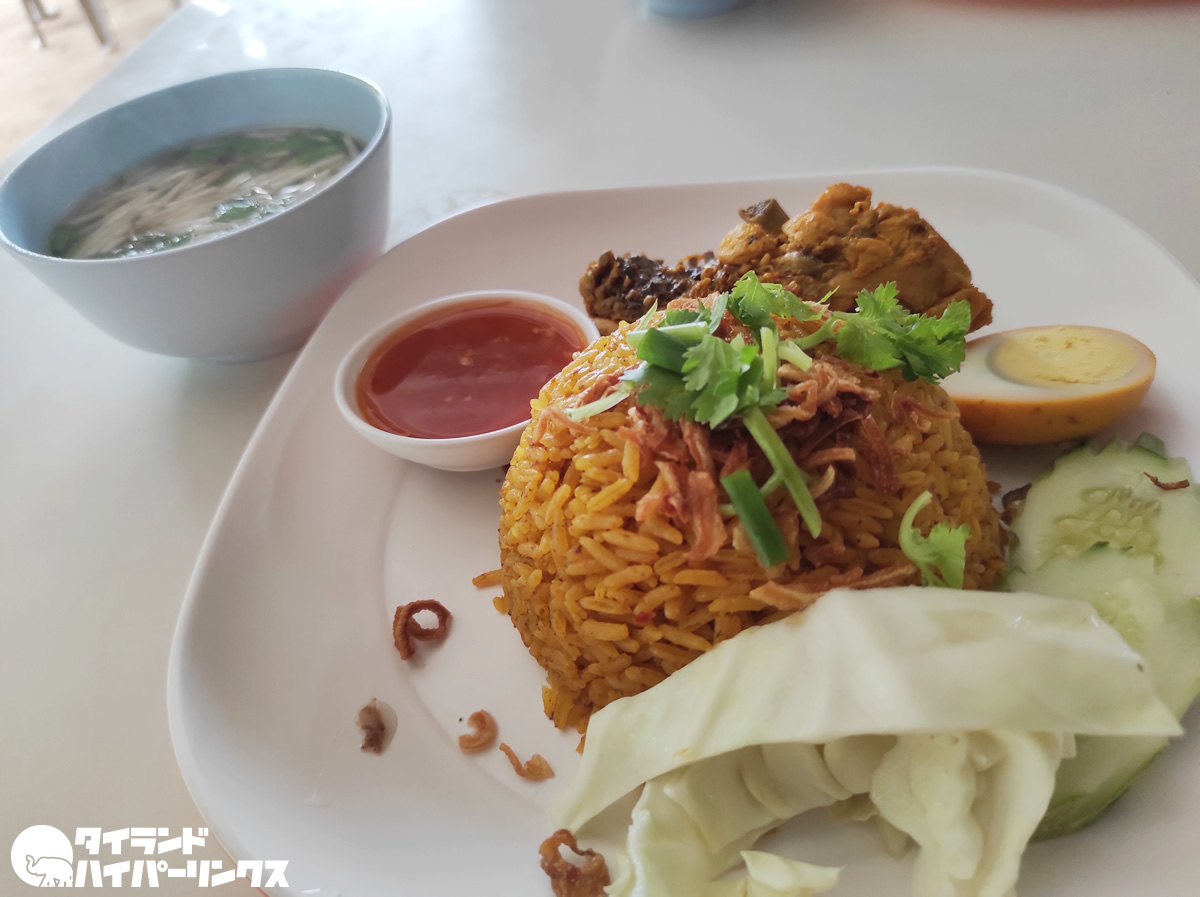 カオモックガイ(ข้าวหมกไก)とは、いわゆるビリヤーニのこと。ご飯とチキンがカレー味のアレですね。「ファーリーダー」にはパッタイやカオマンガイ、マッサマンカレーなど色々メニューは豊富ですが、もちろんオーダーしたのは、一皿50バーツのカオモックガイです!