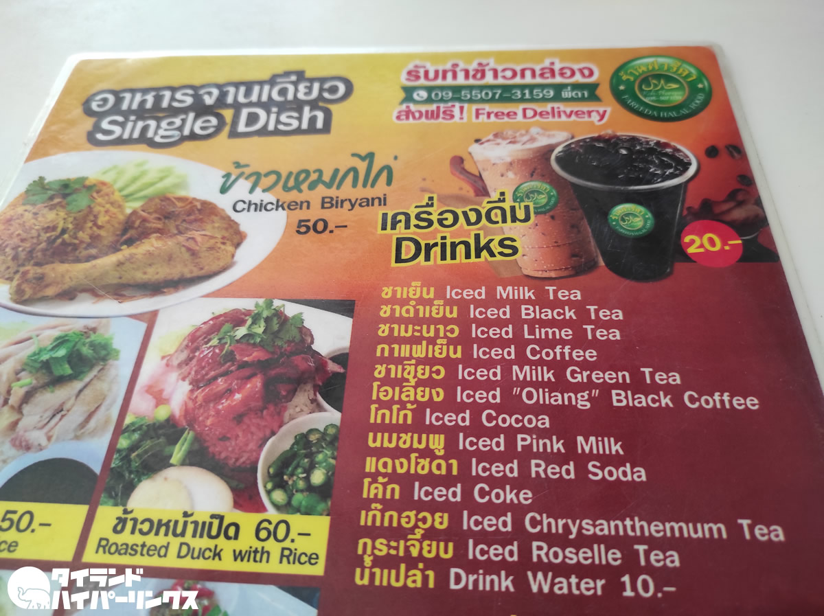通り沿いの食堂「ファーリーダー ハラール フード レストラン(Farida Halal Food Restaurant)」に到着しました。ここのカオモックガイがオススメなわけですね。