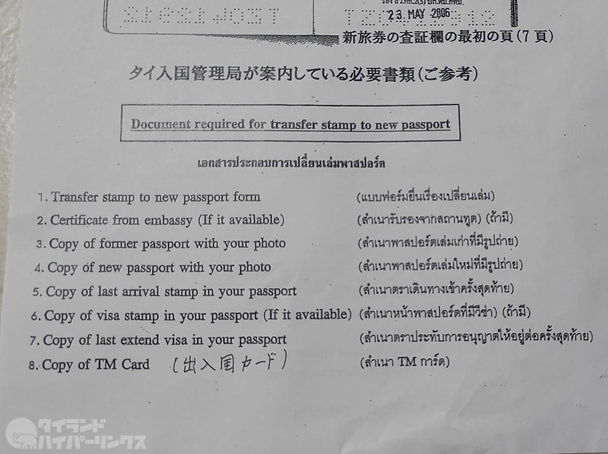 イミグレに持っていくものは、新旧のパスポートと、大使館から受け取ったビザ転記のための書類です。またパスポートやビザのページなどのコピーが必要ですが、イミグレ近くのコピー屋さんなら、「パスポートを新しくしたのでビザを転記します」と言えば、手際よく必要な部分をコピーしてくれます。