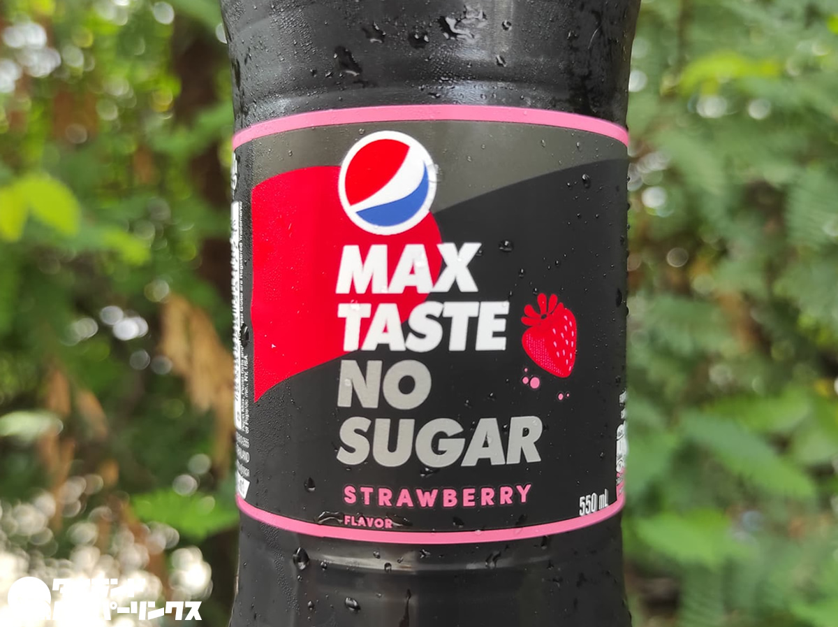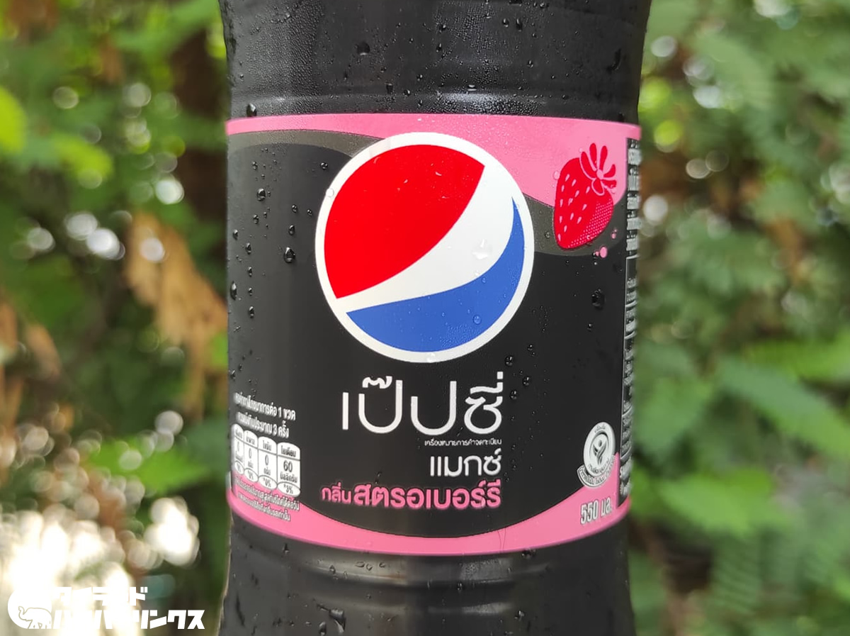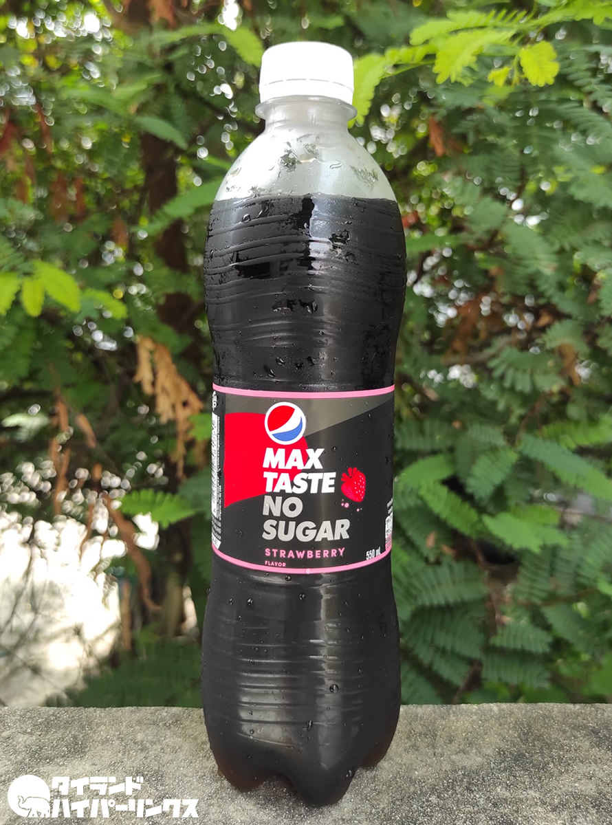 とここまでは余談で、今回コンビニで見つけたのがPepsiの新商品「Pepsi Max Taste No Sugar Strawberry」。つまりイチゴ風味のコーラです。価格は1本19バーツ。早速購入して飲んでみました。