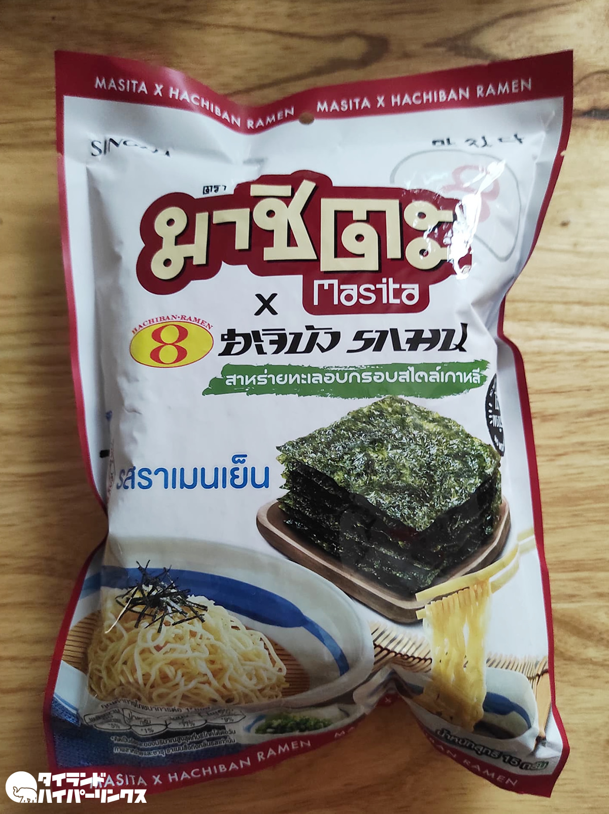 そんな「8番らーめん」が韓国海苔スナックのMasitaとコラボ(มาชิตะ)。「ざるらーめん」風味の韓国海苔スナックが新発売になりました価格は15グラムが一袋39バーツ。