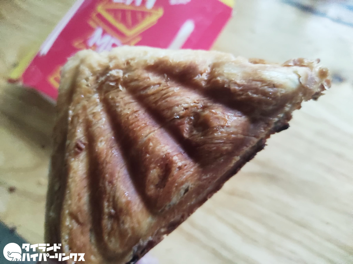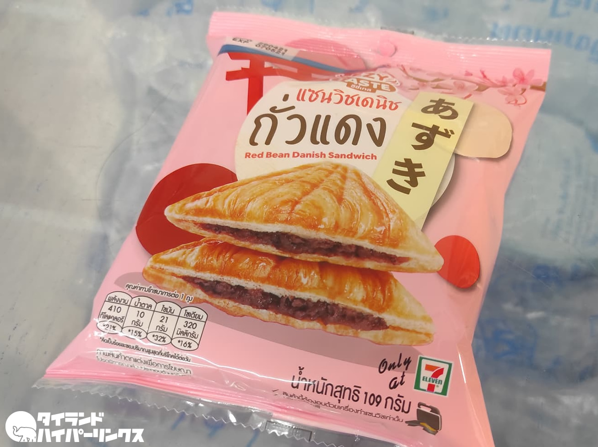 時々セブンイレブンのホットサンド(ツナやハム&チーズ)を食べたくなるので、この日もいつもの店内の棚へ。するとピンク色に輝く新商品が目に入りました。あずき(小豆)のホットサンド「แซนวิชเดนิชถั่วแดง(サンドイッチディッシュトゥアデーン)」です。価格は25バーツ。