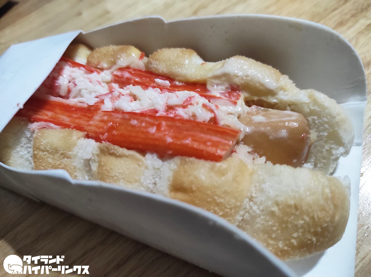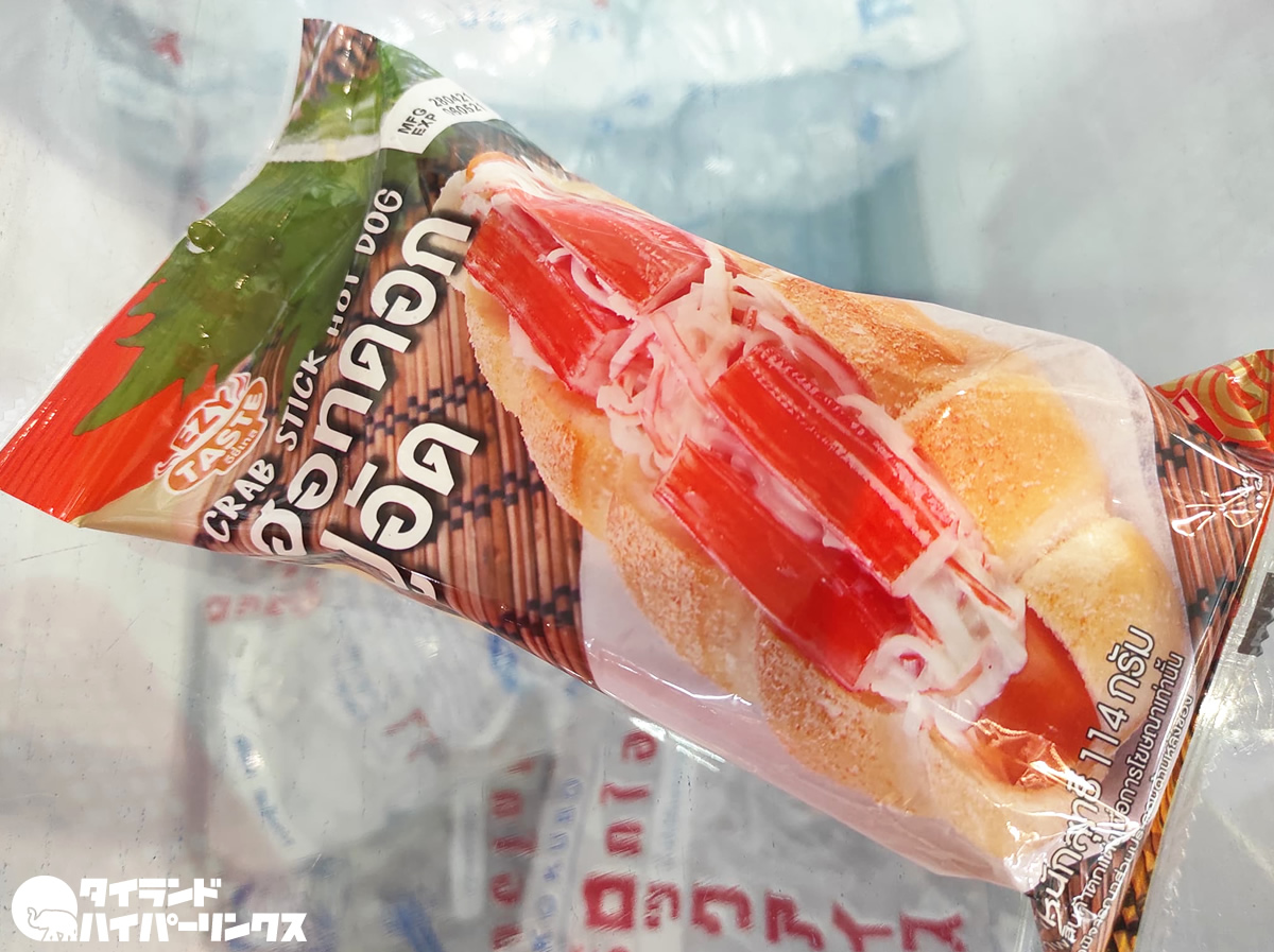 そんな中でセブンイレブンで見つけたのが、新発売のカニカマのホットドッグ「ホットドッグ・プーアット(ฮอทดอก ปูอัด)」。価格は一つ35バーツ。早速購入し、温めてもらい、実食です。