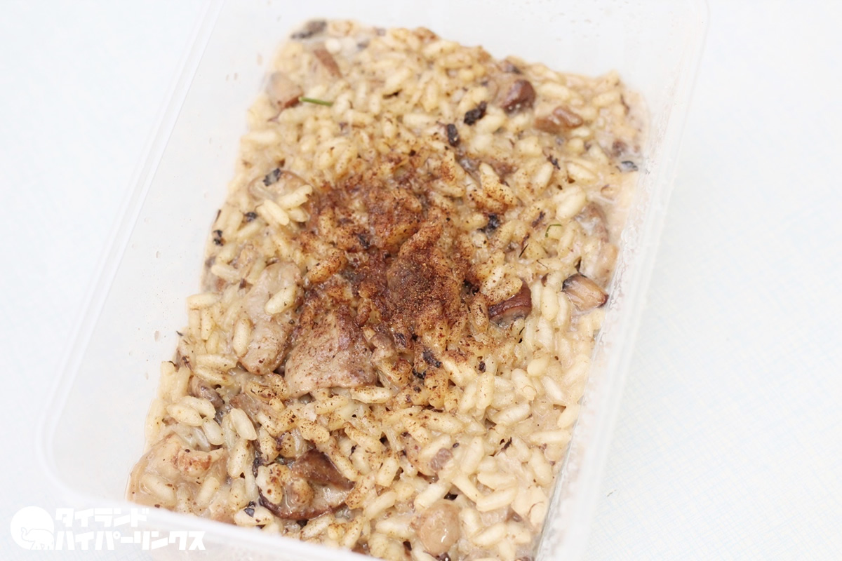 「ポルチーニマッシュルーム入りトリュフソースのリゾット(RISOTTO PORCINI E TARTUFO)」(490バーツ)。トリュフって料理名に入っているとテンション上がりますよね。テイクアウトのパッケージを開けると、フワッと茸の香りがして一同うっとり。