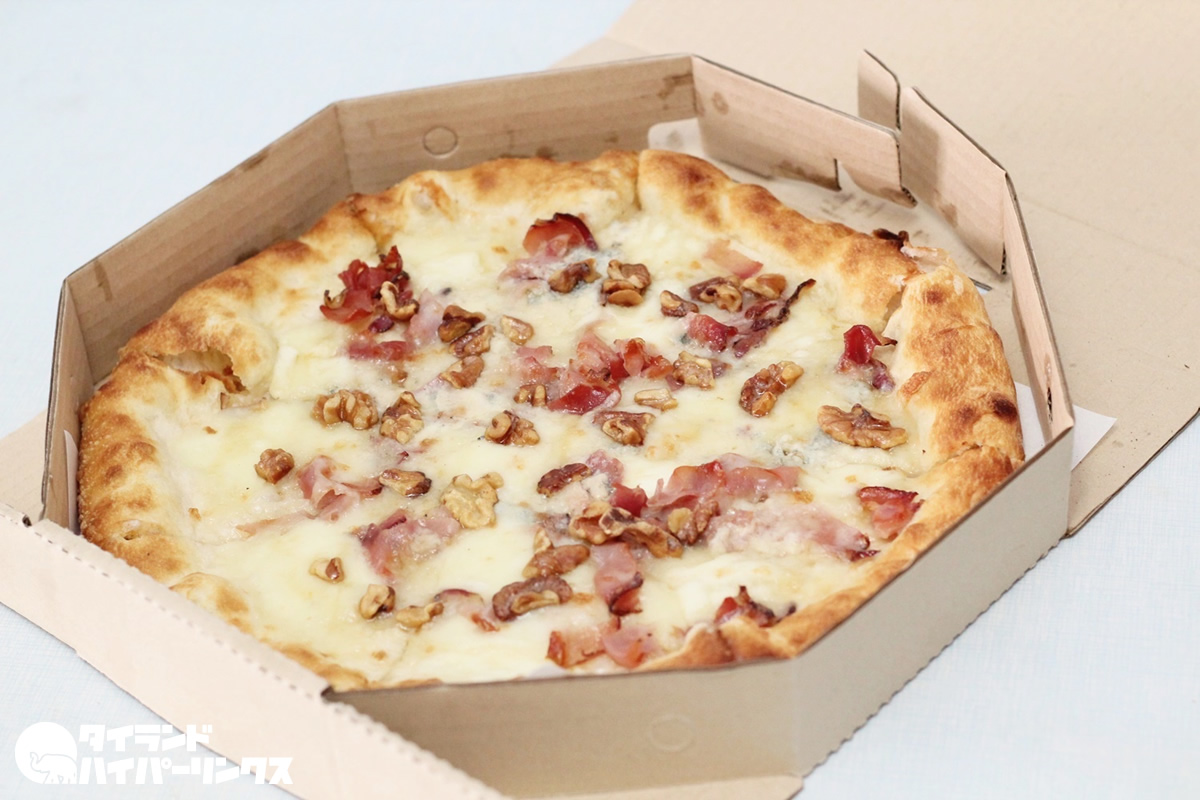 お店自慢だというピザは「水牛のモッツアレラチーズ、スモークハム、ゴルゴンゾーラチーズ、クルミ載せピザ(PIZZA SPECK GORGONZOLA NOCI MIELE)」(590バーツ)を選びました。食感が堪りませ~ん!