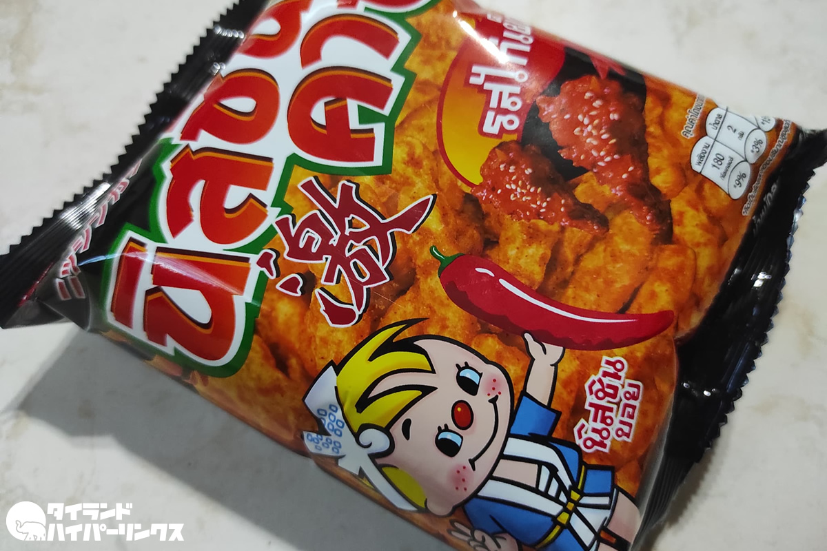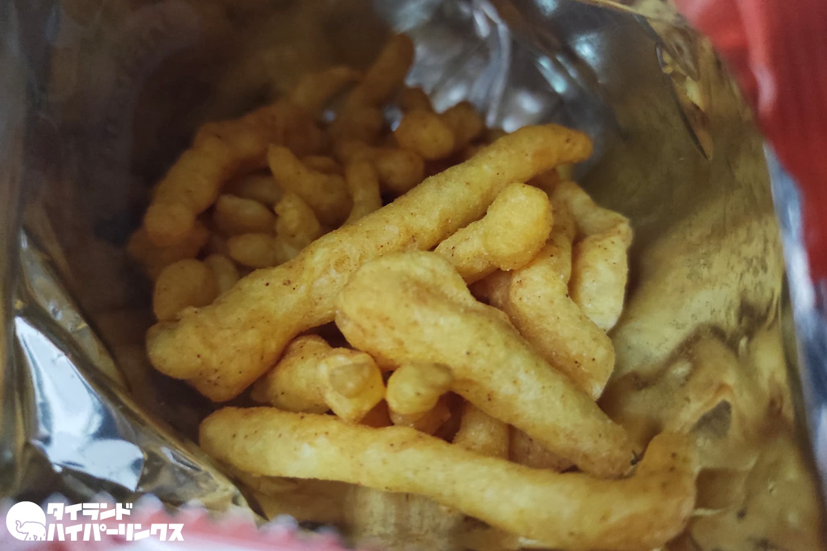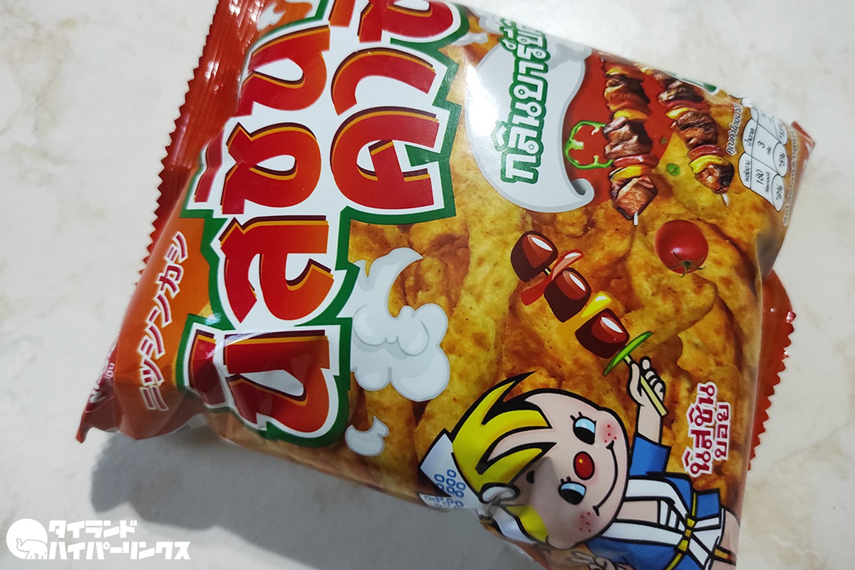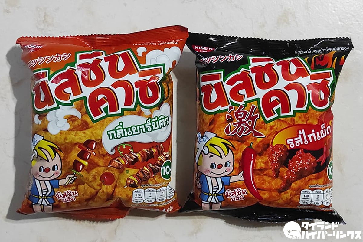 「ニッシンカシ」は34グラム袋で10バーツ。今回購入したのは「バーベキュー味(กลิ่นบาร์บีคิว)」と「スパイシーチキン味(รสไก่เผ็ด)」ですが、「スパイシーチキンチーズ味(รสไก่เผ็ดชีส)」と「塩漬け卵とスパイシーチキン味(รสไก่เผ็ดไข่เค็ม)」を加えて、全4種類あるようです。