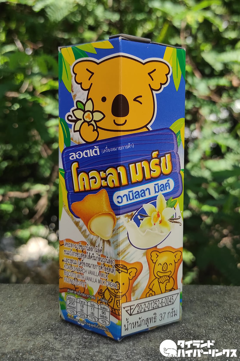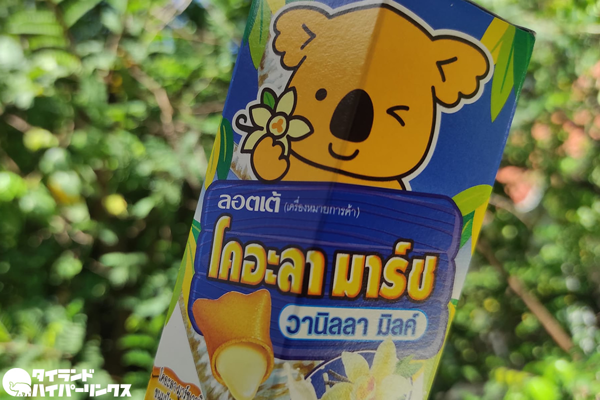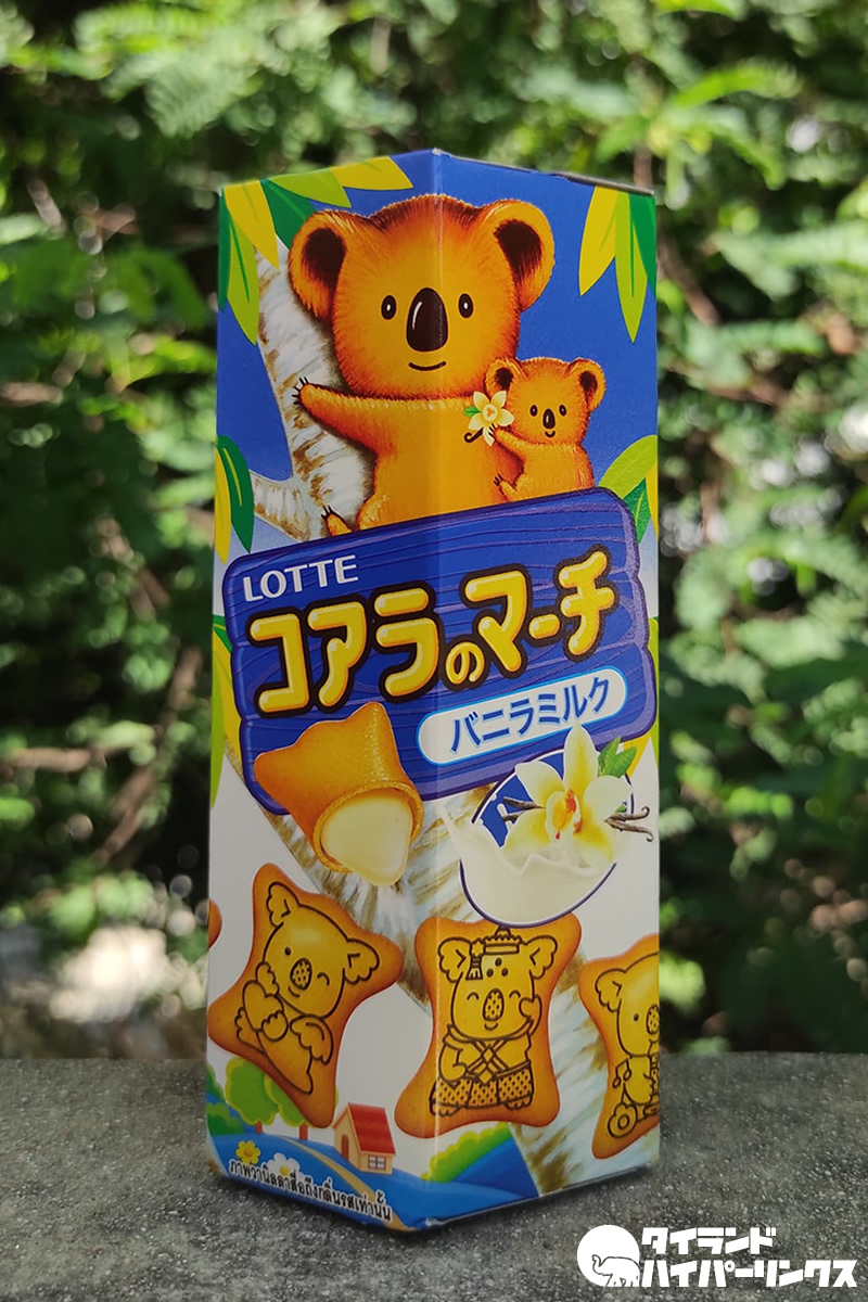この日見つけたのはコアラのマーチの「バニラミルク(วานิลลามิลค์)」。以前にも見たことがあるような気がして、その場でスマホで調べてみると、どうやら「バニラミルク」は新商品のようです。早速購入、一つ20バーツでした。
