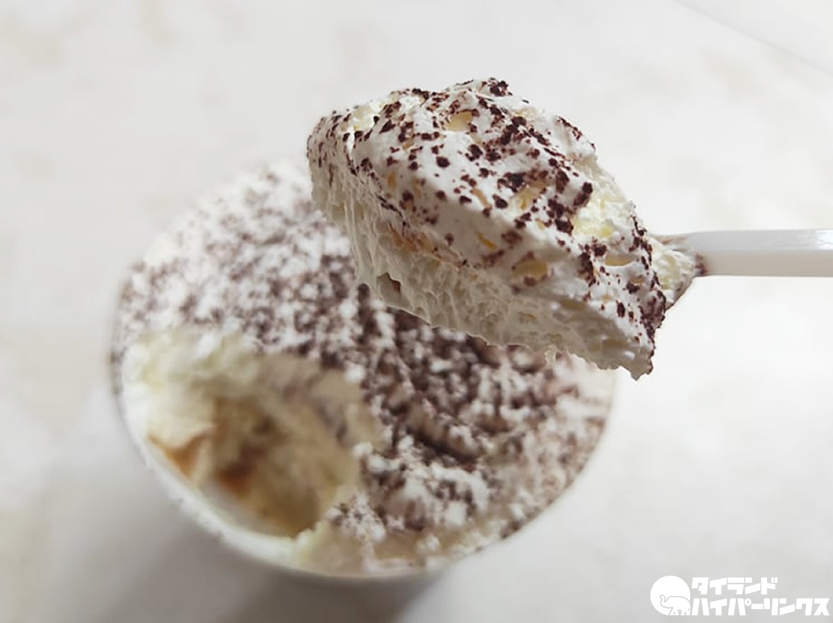 まずは上の方から一口。日本らしく甘過ぎないクリームが美味。それに下の層のバナナペースト、そして一番下のチョコポンじまでを一緒に口にいれれば、それはまさしくチョコバナナです。気になる方は、お試しを。
