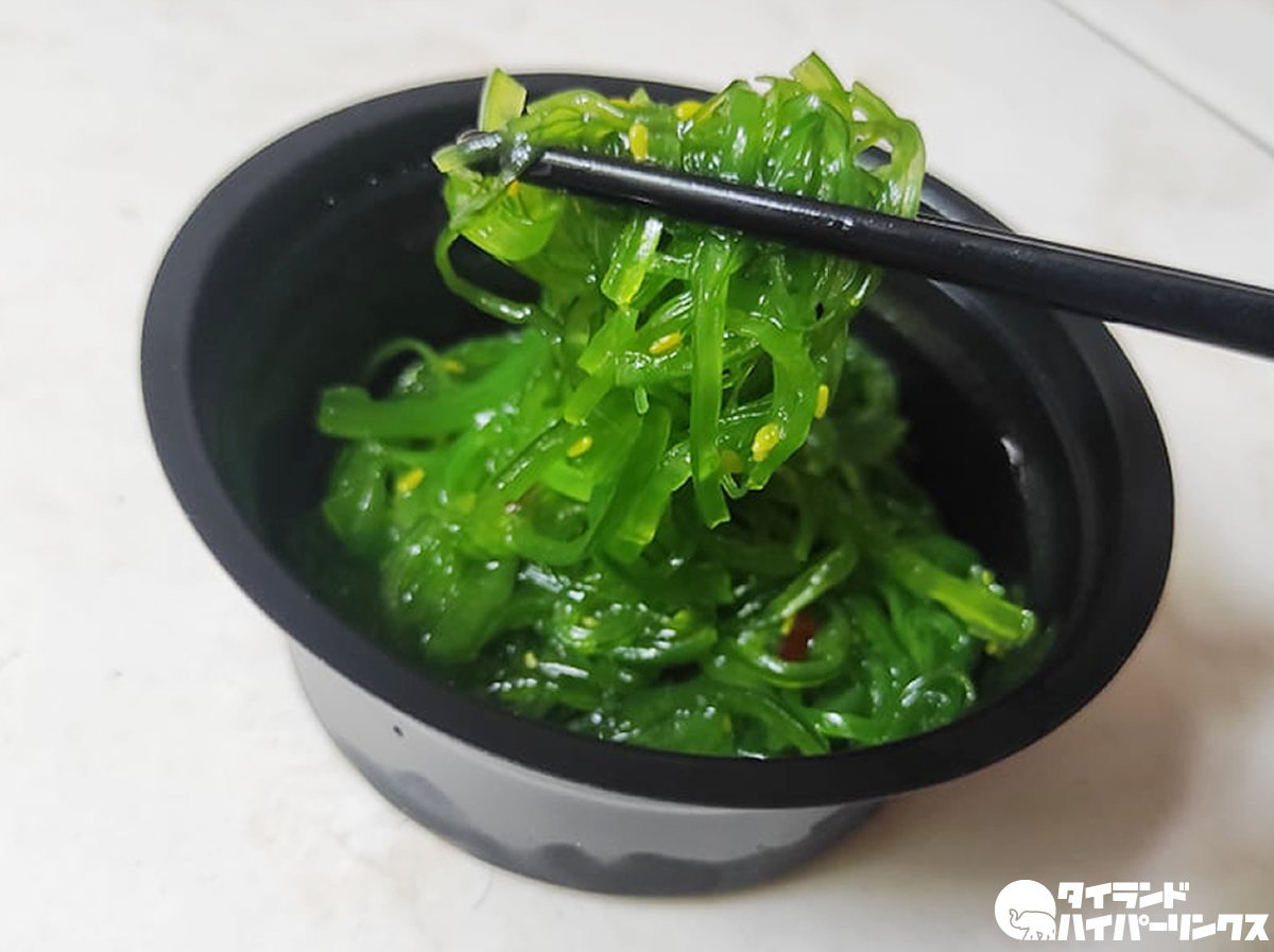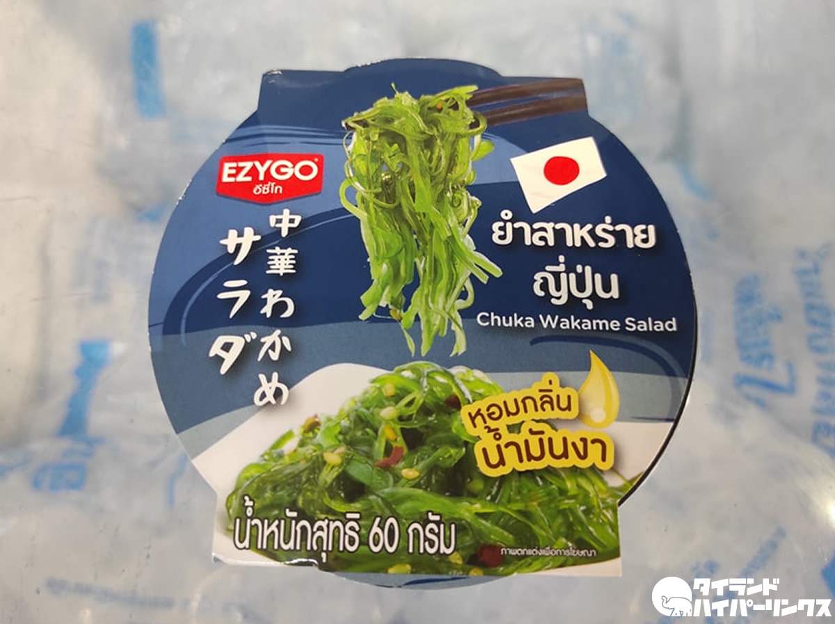 商品名は日本語では「中華わかめサラダ」ですが、タイ語になると「ยำสาหร่ายญี่ปุ่น(ヤムサラーイイープン)」。ヤムがサラダ(和え物)、サラーイがわかめ、イープンが日本なので、中華が日本に代わってしまいました!中国人の皆さんが怒りませんように・・・。