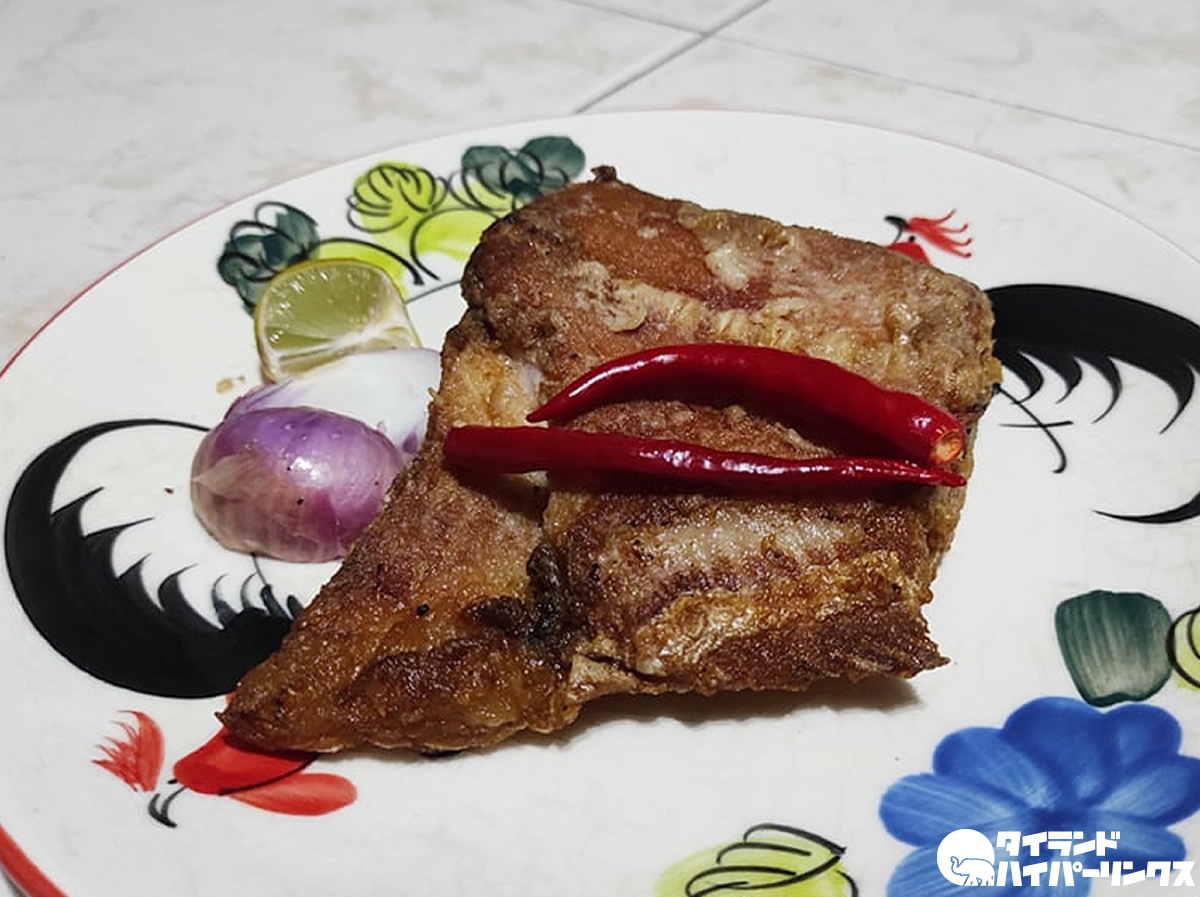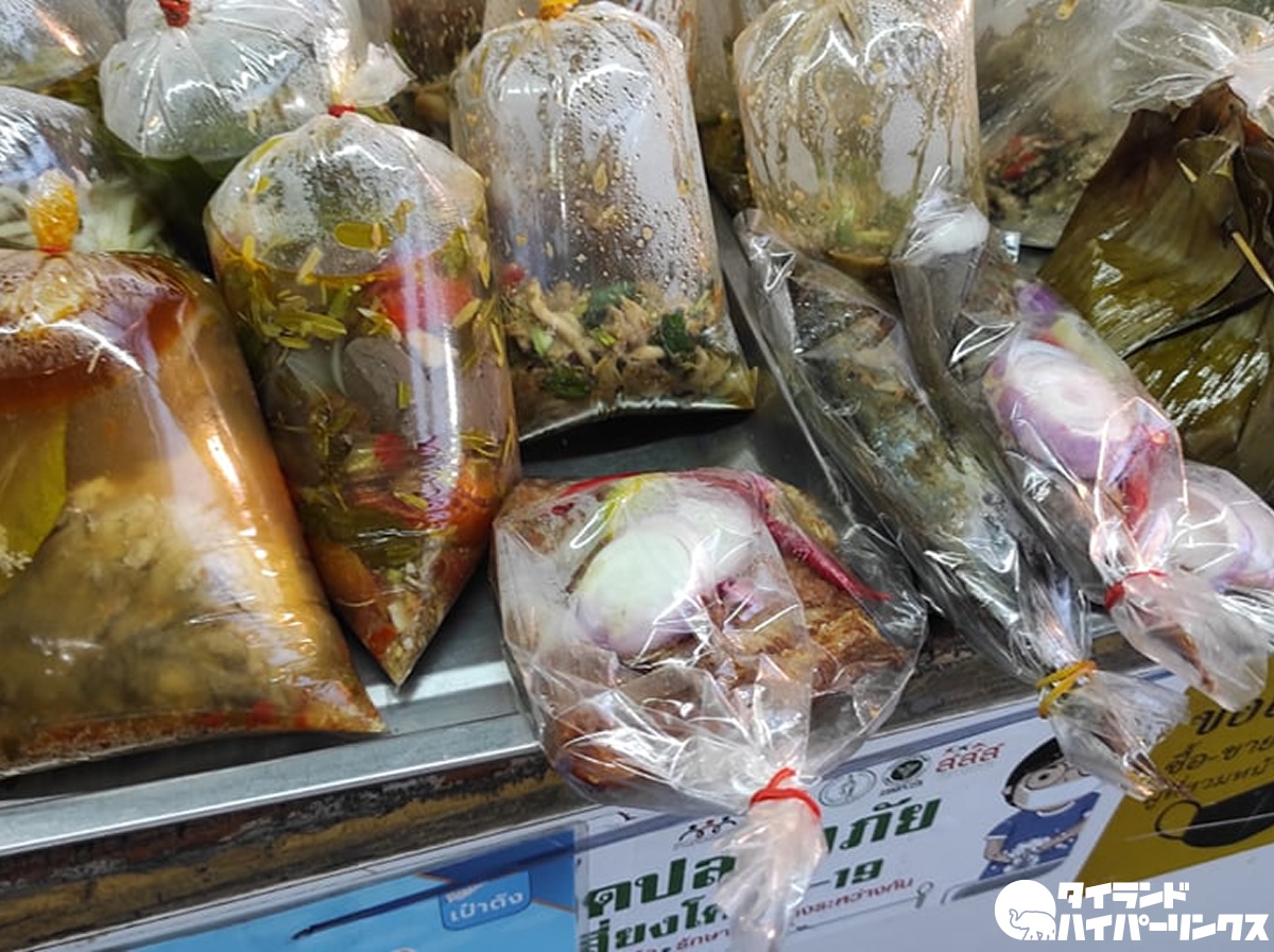 街の市場の惣菜屋さん。上の写真で真ん中に見えるのが「プラーソムトード(ปลาส้มทอด)」、魚を発酵させた「プラーソム」を揚げたものです。これをモチ米と一緒に食べると最高なんですよね!一袋、大きな一切れが入って40バーツでした。