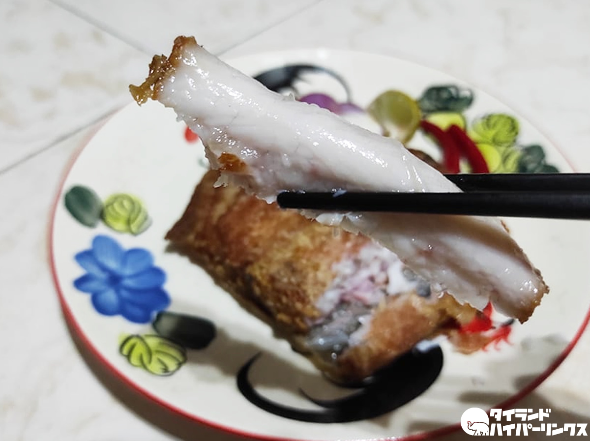 この日買った揚げた「プラーソム」は、発酵が進み過ぎていないのでそれほど酸味もなく、身もしっかりしていて、塩気もちょうどよく、とっても美味しく出来ていました。これはモチ米が進みますね!
