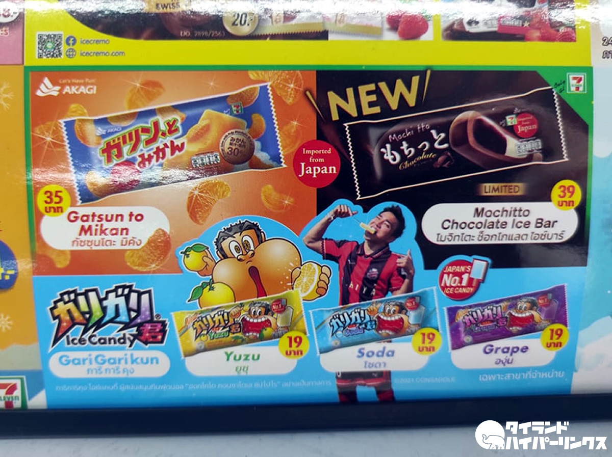 タイのコンビニやスーパーで普通に買える日本のアイスメーカーといえば、グリコ、フタバ食品、そして赤城乳業でしょうか。この日コンビニで購入したのは、北海道コンサドーレ札幌のチャナティップ選手がプレゼンターを務める赤城乳業の「ガツン、とみかん」(35バーツ)です。