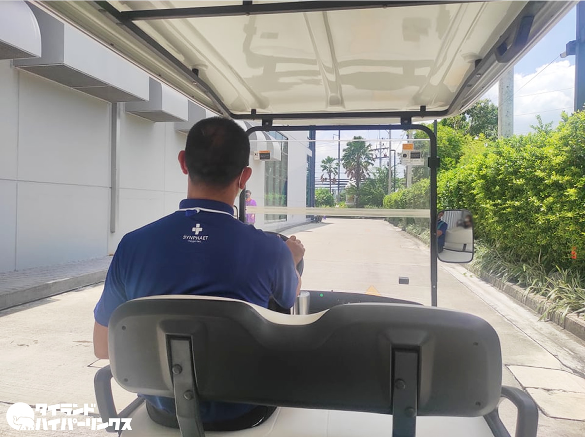 この日は車でシンペート・シーナカリン病院に到着。駐車場に車を停めると、ちょうどお迎えのカートがやってきました。このカートに乗せていただき、病院の入口へ向かいます。(近いので、歩いてもすぐです)
