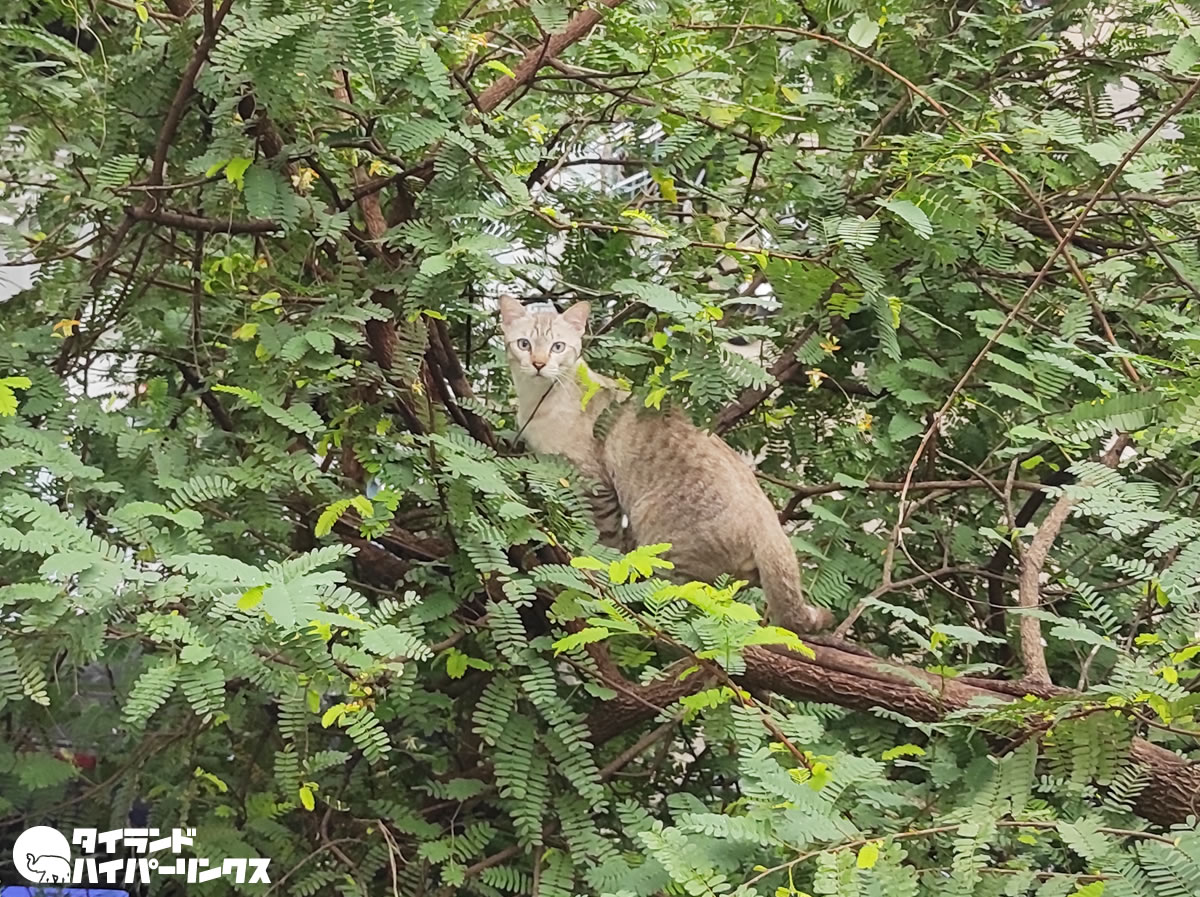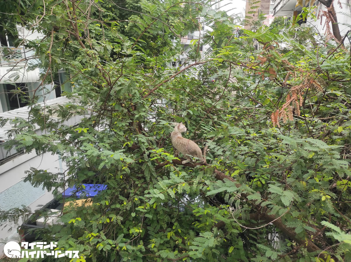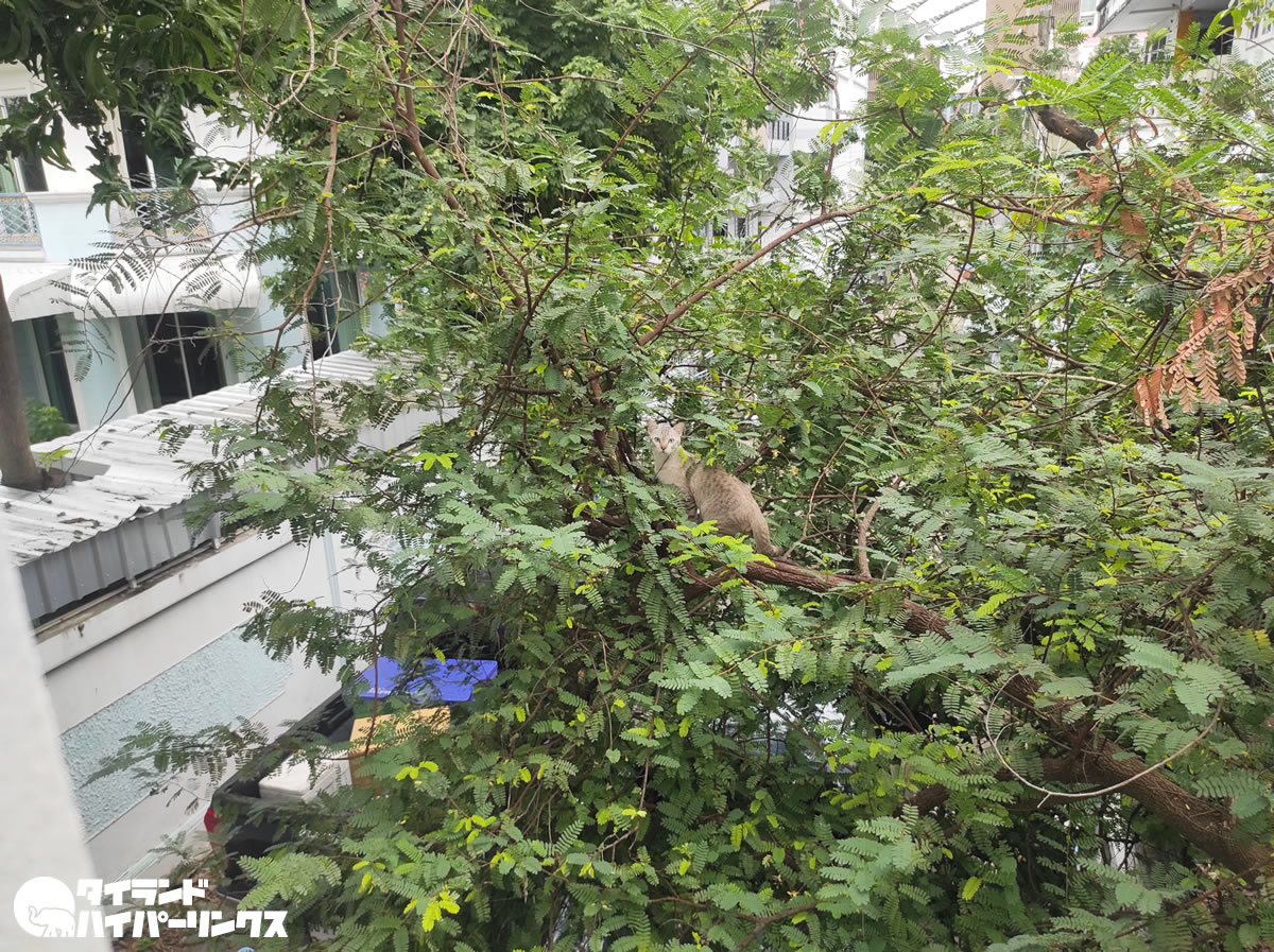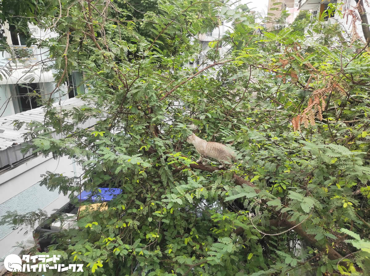 早朝に目が覚めて、バルコニーに出て外の空気を吸っていると、隣の家の庭の方からガサガサという音が聞こえてきました。きっといつものようにリスか野鳥かと思ったら、目に入ってきたのは木の上のネコでした。