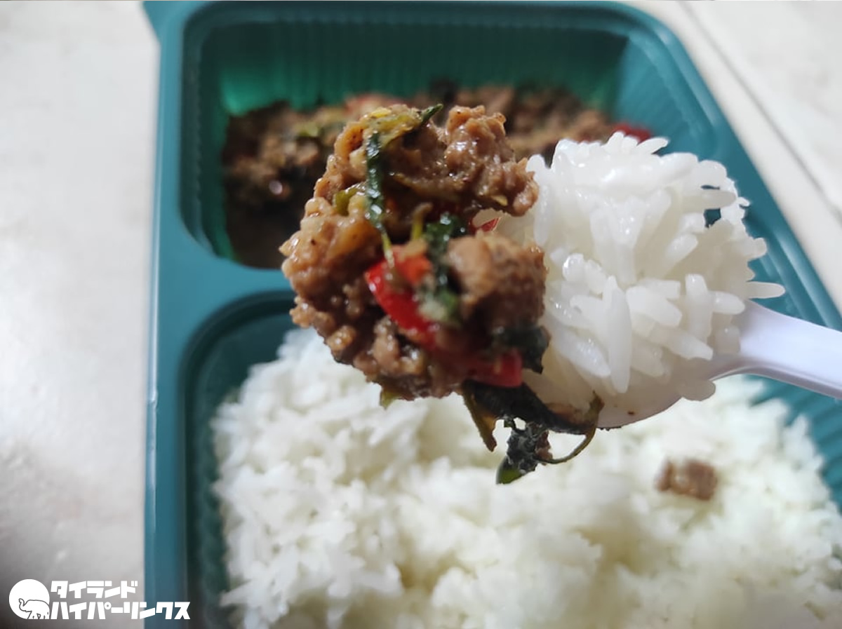 この日に購入したのは、牛肉のガパオライスの弁当。写真を見ていただいても分かる通り、牛肉のガパオ炒めがたっぷりで、味もあたかもレストランのガパオライスの様なハイクオリティ。なかなか満足度は高めの一品です。