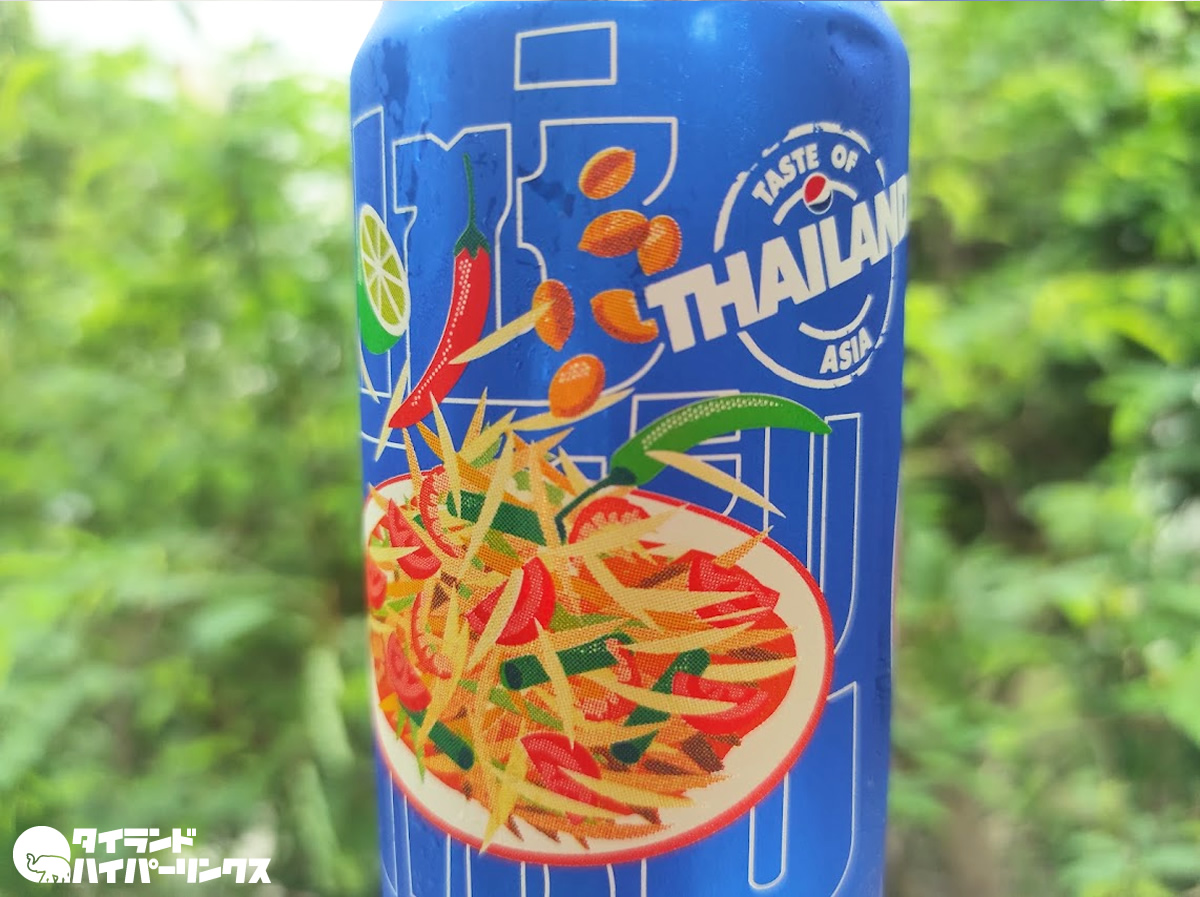 最近では、コカ・コーラが缶のデザインをリニューアルして、スッキリとかっこよくなりましたが、ペプシも負けていません。この日はコンビニで「TASTE OF THAILAND(タイの味)」と書かれたデザインのペプシ缶を発見。そこに描かれていたのは、タイ人のソウルフード「ソムタム(ส้มตำ)」でした。いわゆるパパイヤサラダです。