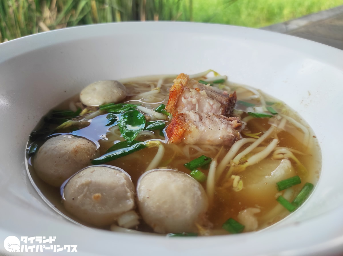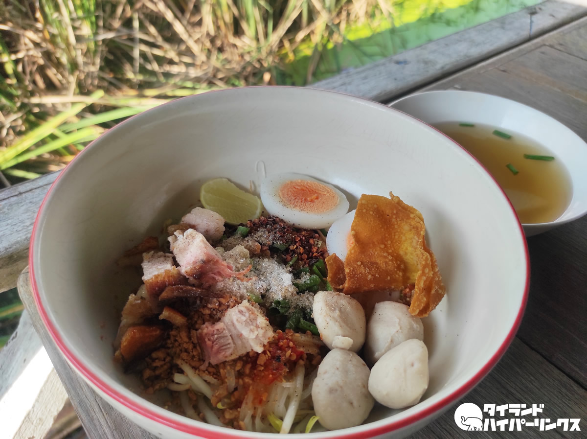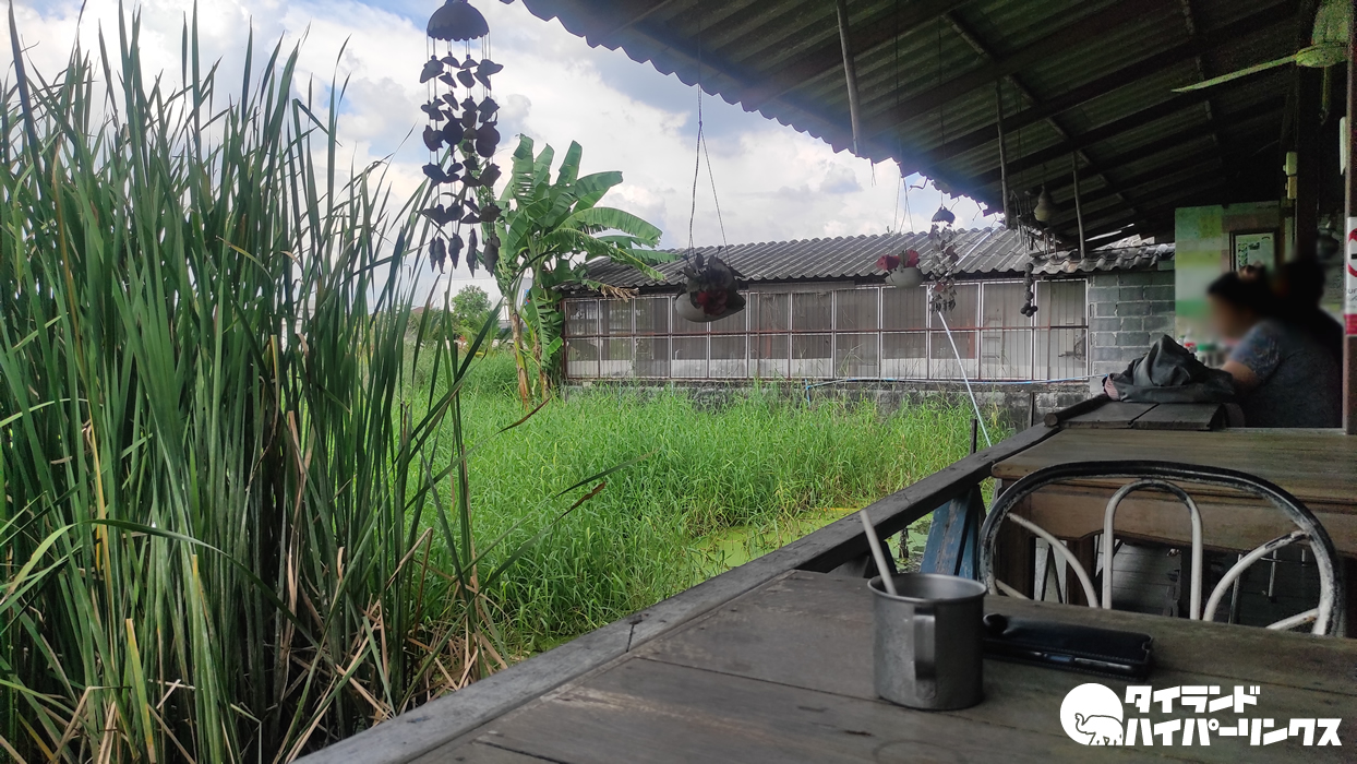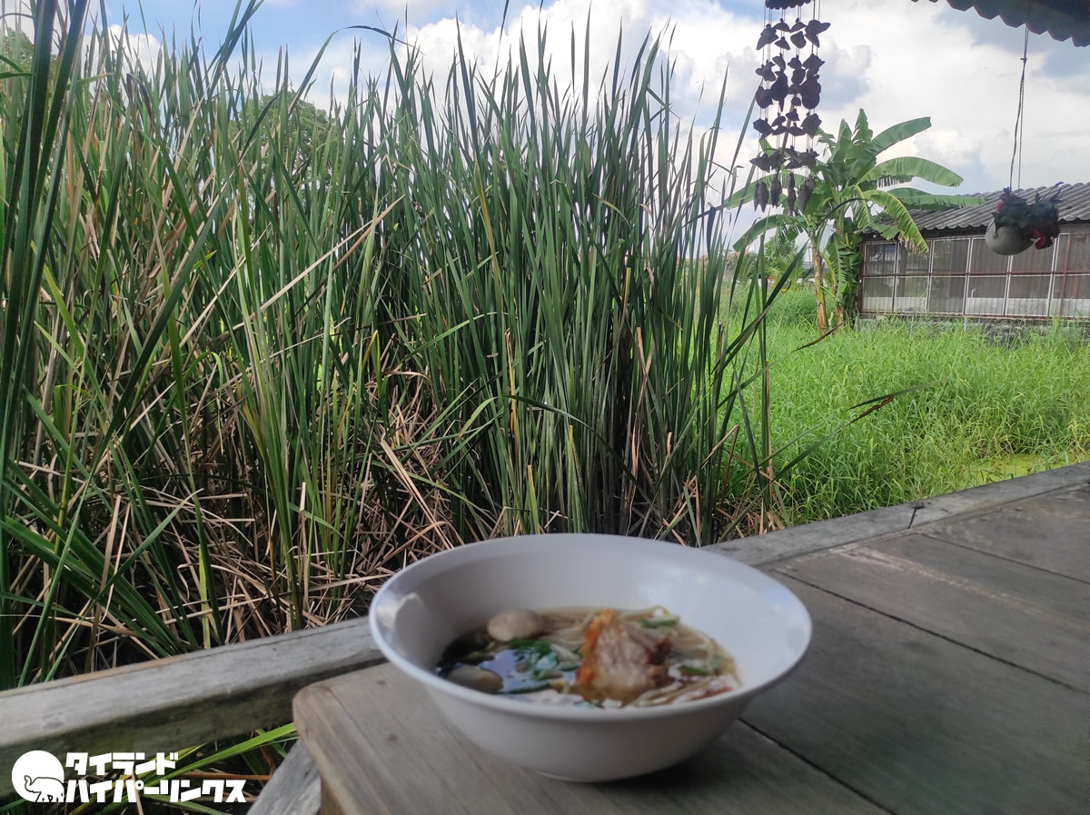 「クワイティアオルークチンムー ナーイクン(ก๋วยเตี๋ยวลูกชิ้นหมูนายขุน)」は、つなぎで小麦粉を使わない100%豚肉の自家製ルークチン(肉団子)が人気だという、タイヌードル食堂。ここで美味しい食事と合わせて楽しめるのが、店の裏の沼(あるいは池なのか湿地なのか)の景色です。この時も先客が、カウンター席に座ってちょっとした自然を眺めながら食事中でした。