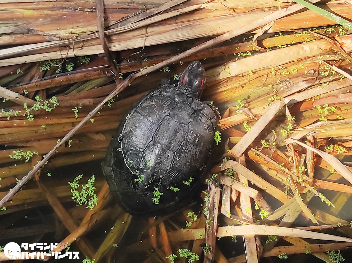 席から沼を覗き込んでみると、亀が甲羅干し中でした。これは耳の部分が赤いので、アカミミガメですね。(参照 タイで「日本亀」と呼ばれるのは・・・)