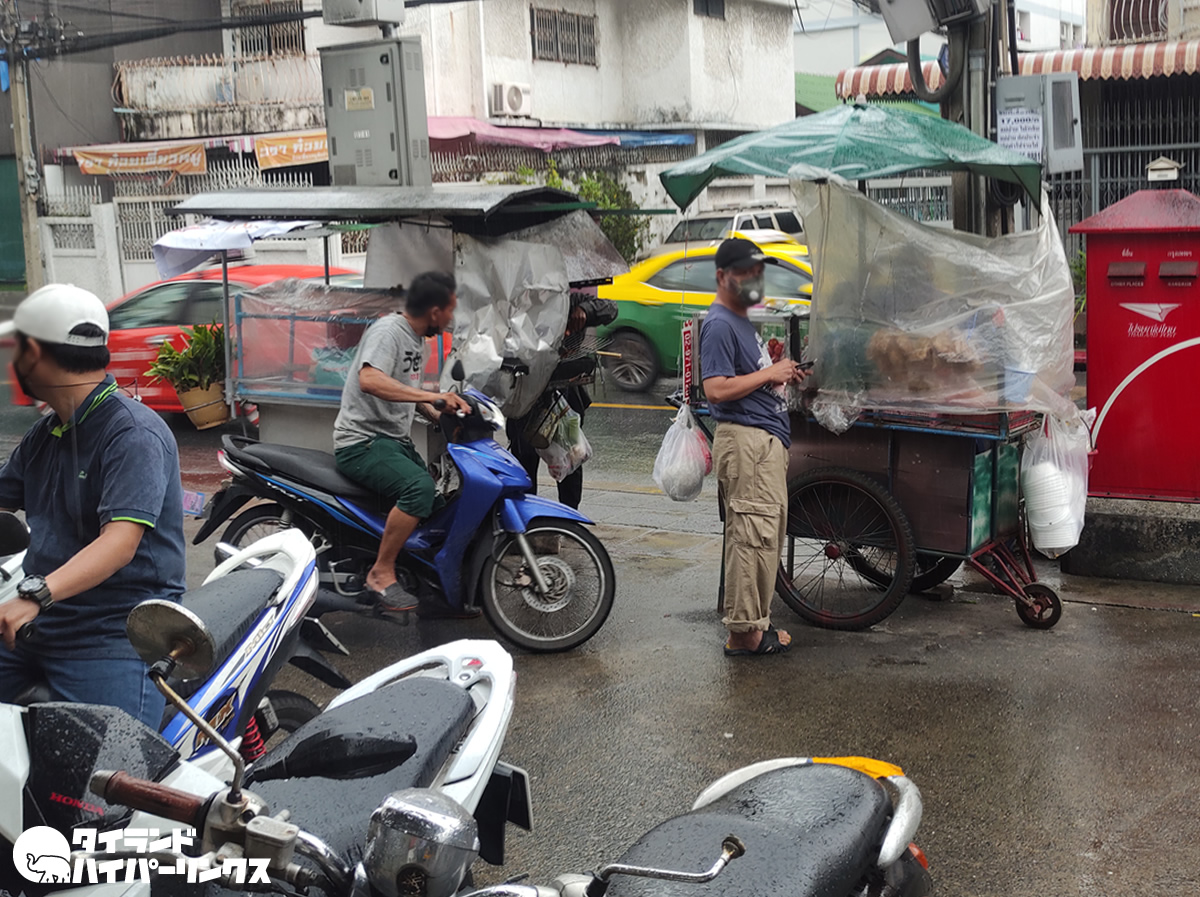 屋台はビニールでカバーされ、おばちゃんたちはコンビニの軒先に避難。