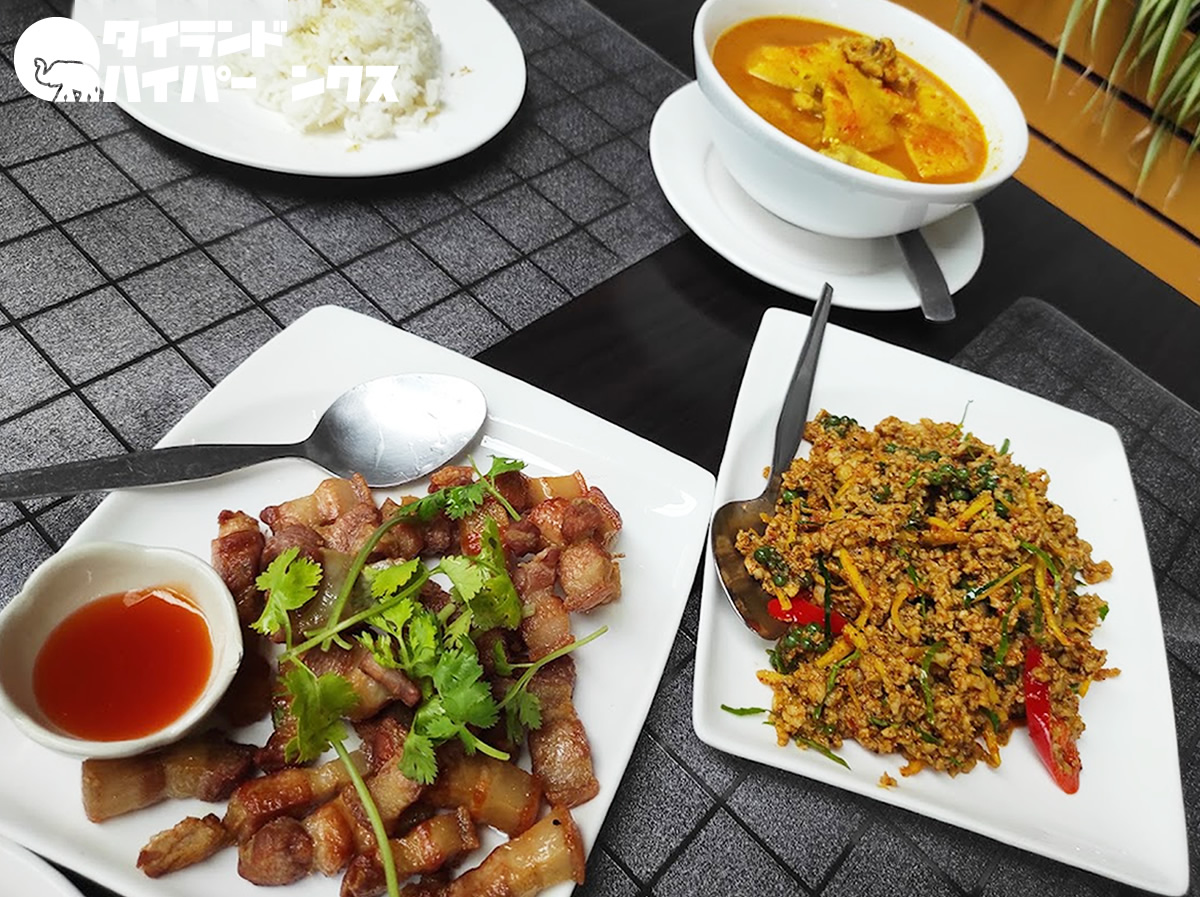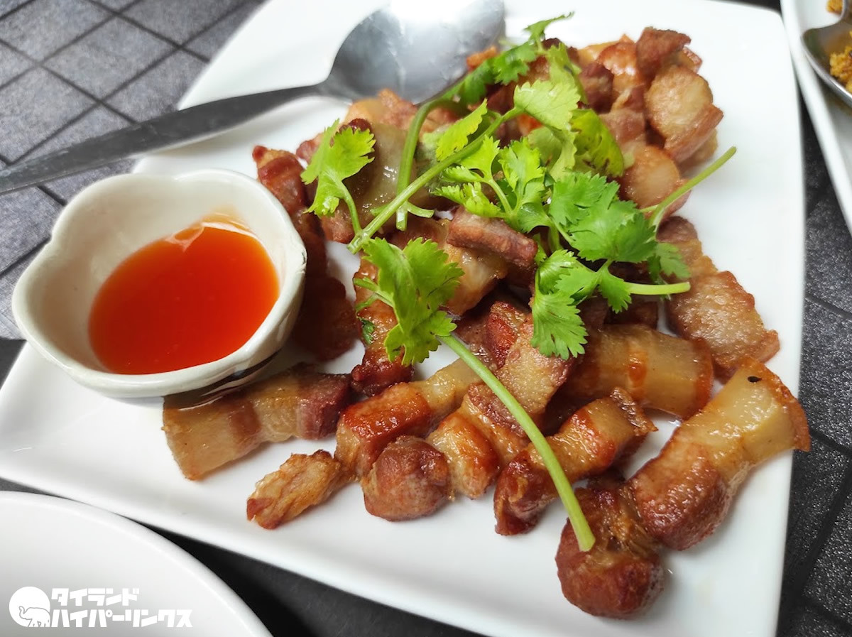豚肉を食べないイスラム教徒が多い南タイですが、以下は豚肉を使った料理。美味しいことは最初から分かっていた塩味の豚肉揚げ「ムートードクルア(หมูทอดเกลือ、Fried salt Pork)」価格は180バーツ。