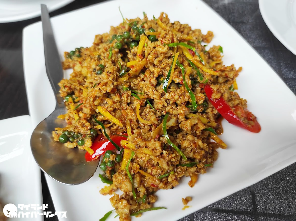 バンコクでも何度が食べたことがある豚ひき肉の「クアキンムー(คั่วกลิ้งหมู、Stir Fried minced Pork with and lime leaf)」価格は180バーツ。