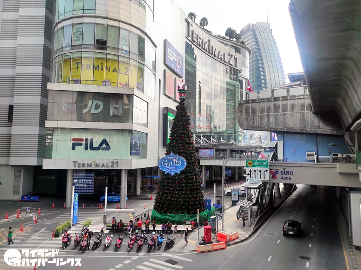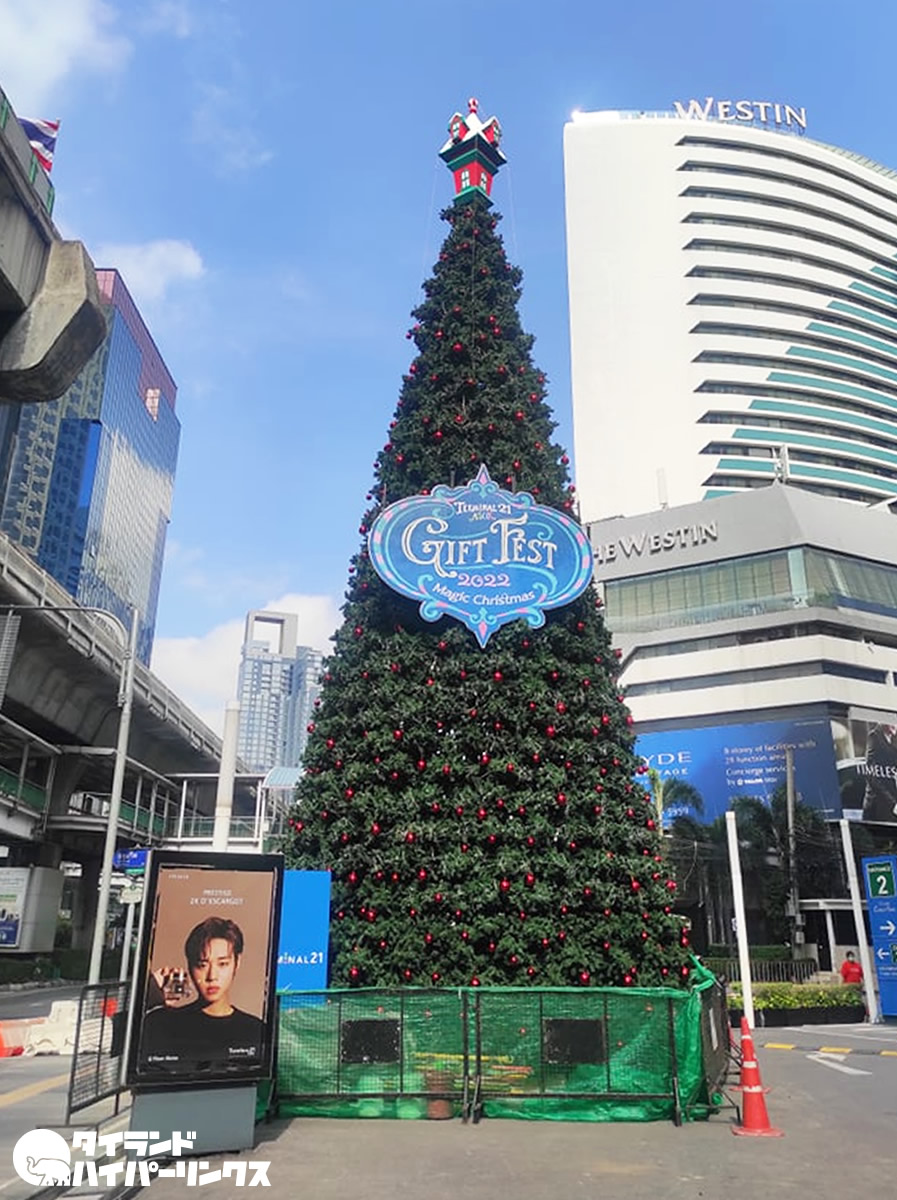 バンコクの中心部、BTSアソーク駅前にあるショッピングセンター・ターミナル21前。ここでは既に巨大なクリスマスツリーが設置されていました。もしかしたら、過去に見た中で一番はやいクリスマスツリーかも・・・。