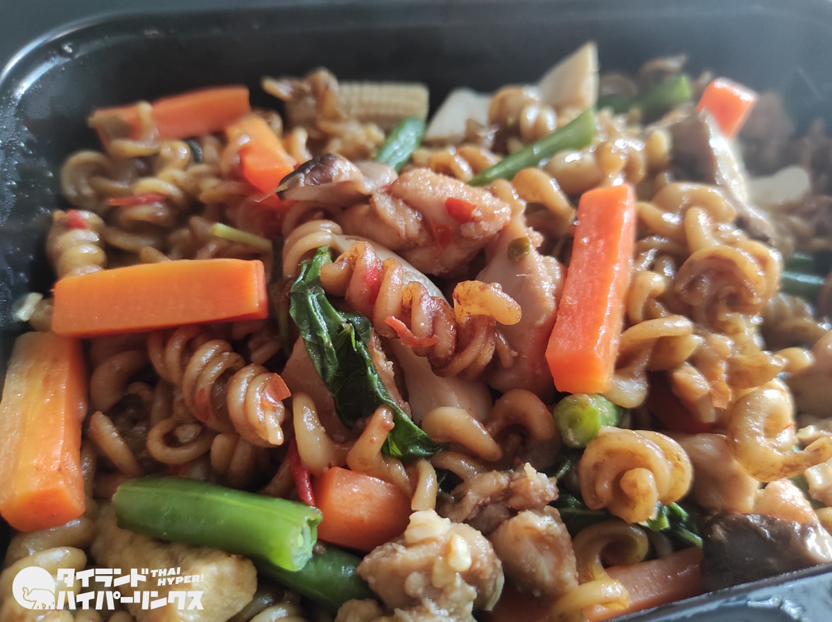 この度発売になったのは、「フーシリーパットキーマオガイ(ฟูซิลลี่ ผัดขี้เมาไก่)」という料理。パスタのようなクルクル巻かれた麺が、鶏肉などたっぷりの具材と共にピリ辛に炒められた一品です。