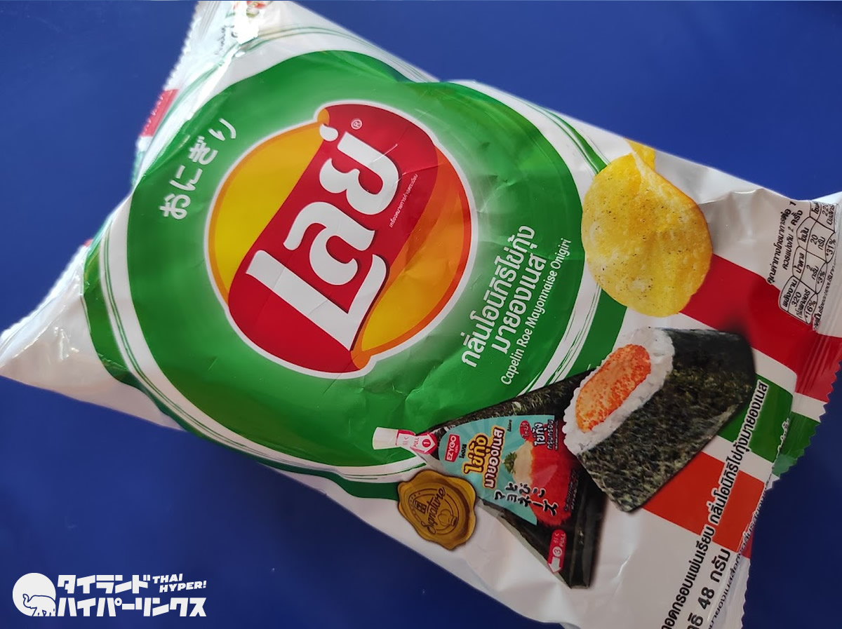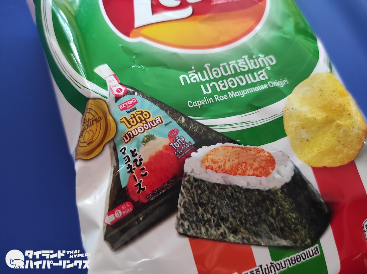 この日にセブンイレブンで発見したのが、タイの最大手ポテトチップスブランドLay’s(レイズ)の、おにぎり味ポテトチップス。これはセブンイレブンで発売されているEZYGOの「とびこマヨネーズおにぎり」ですね。なおタイで「とびこ」は「ไข่กุ้ง(カイクン)」と呼ばれていて、日本料理屋さんでは欠かせない食材になっています。