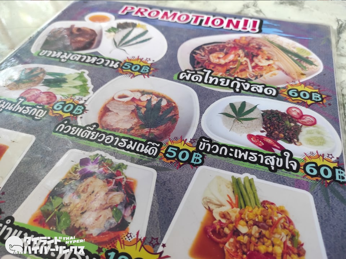 カオカームー、タイヌードル、ガパオライスなど大麻入りの料理には「ハッピー」「良い気分」などの名前が付けられているんですね。なお大麻が置かれていない料理にも、大麻を入れることができるそうです。