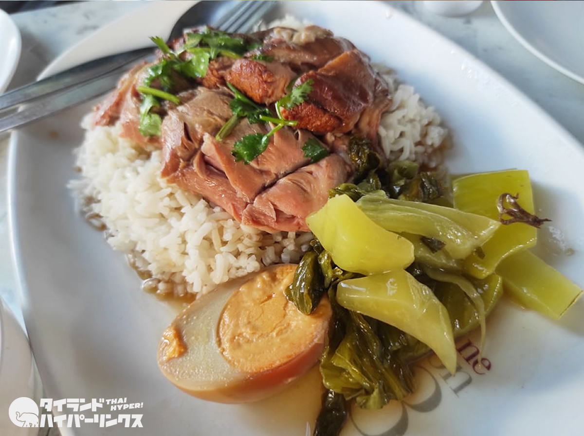 豚足ご飯「カームー・ターワーン(ขาหมูตาหวาน)」(50バーツ)。これはお勧めの一つです。