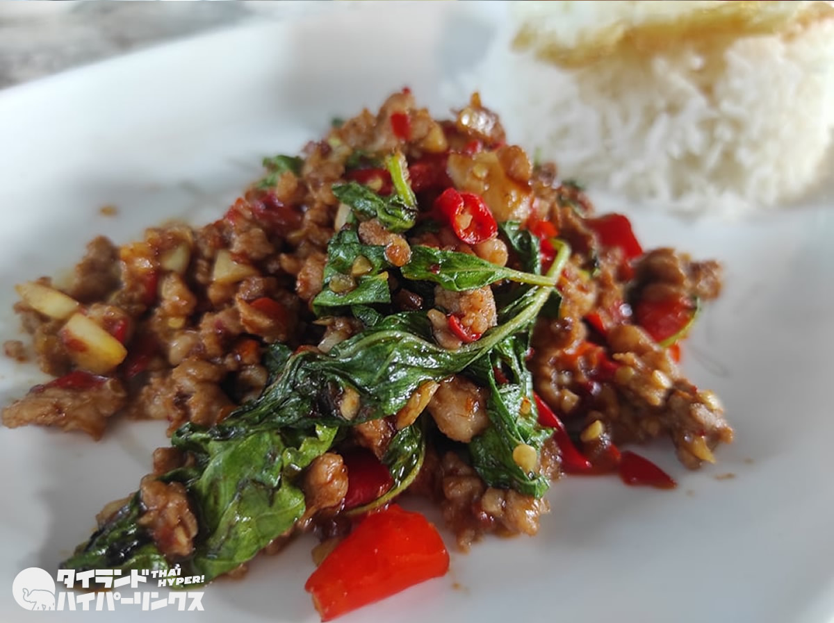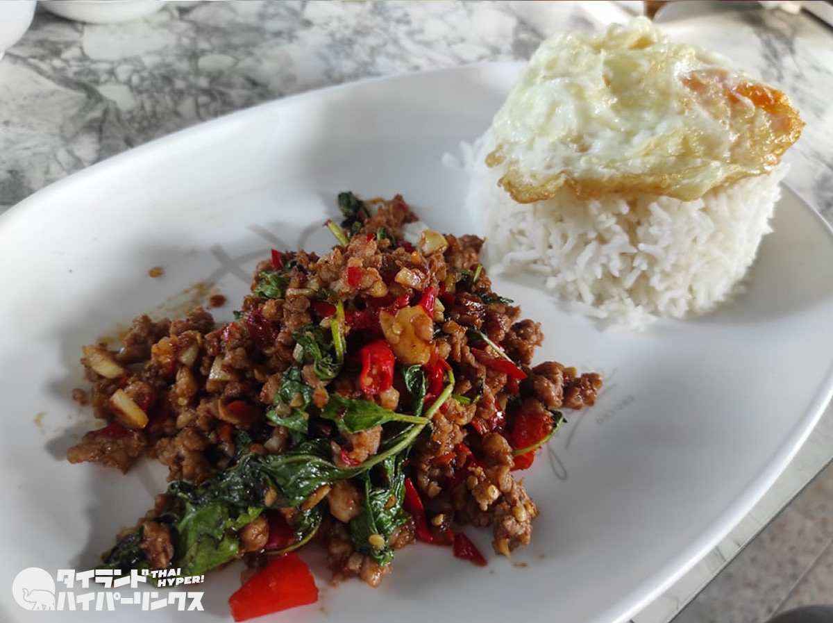 ハッピーガパオライス「ガパオ・スクジャイ(กระเพาสุขใจ)」(50バーツ)。目玉焼きは+10バーツ。レストランの味、といった感じのガパオライスでした。