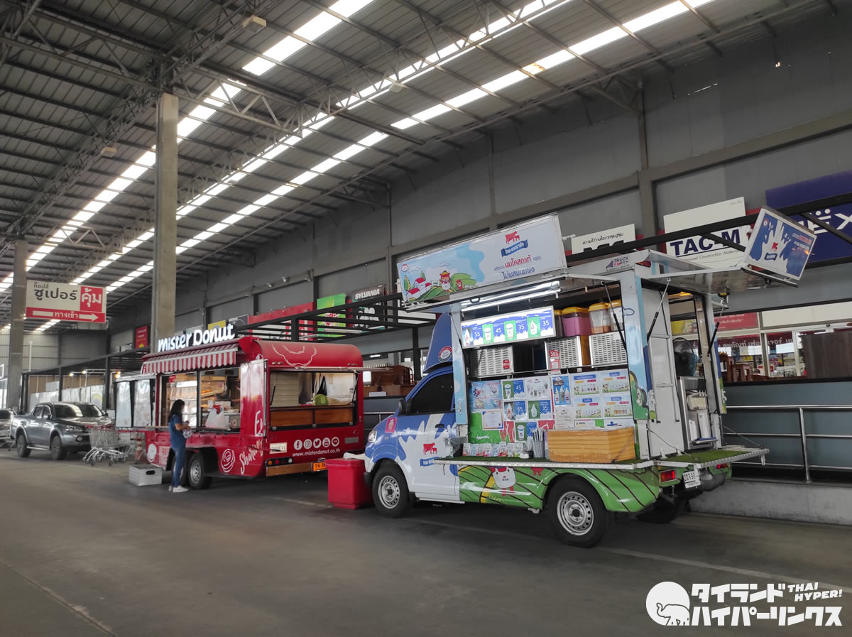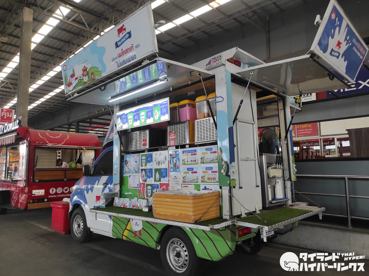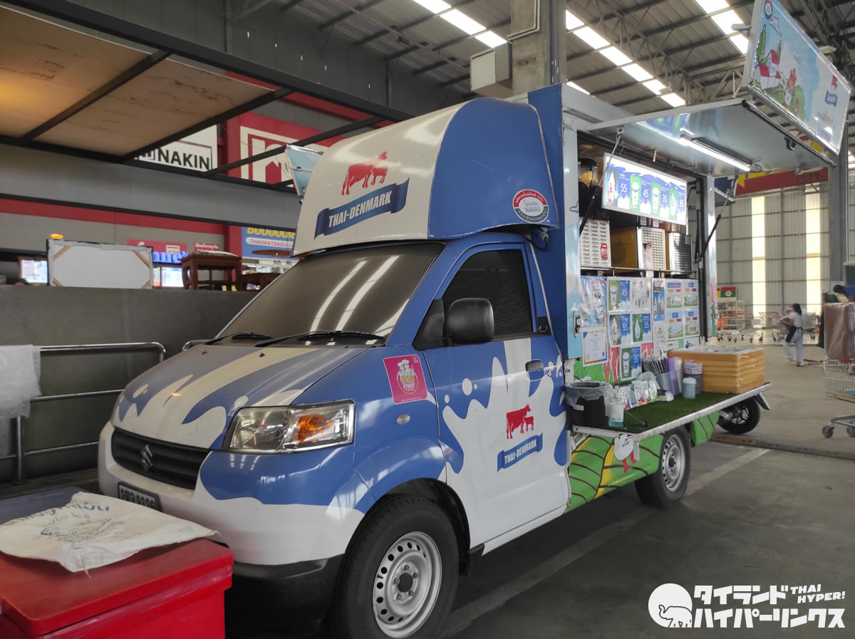 バンコク・ブンクム区のナワミン通りにあるホームセンター「タイワサドゥー・ナワミン店」。店舗も巨大なら駐車場も巨大で、その一角にフードトラックが出ていました。お馴染みの「ミスタードーナツ(mister donuts)」と、「タイ-デンマーク(Thai-Denmark)」。「タイ-デンマーク」は、言わずと知れたタイの牛乳メーカーの大手です。